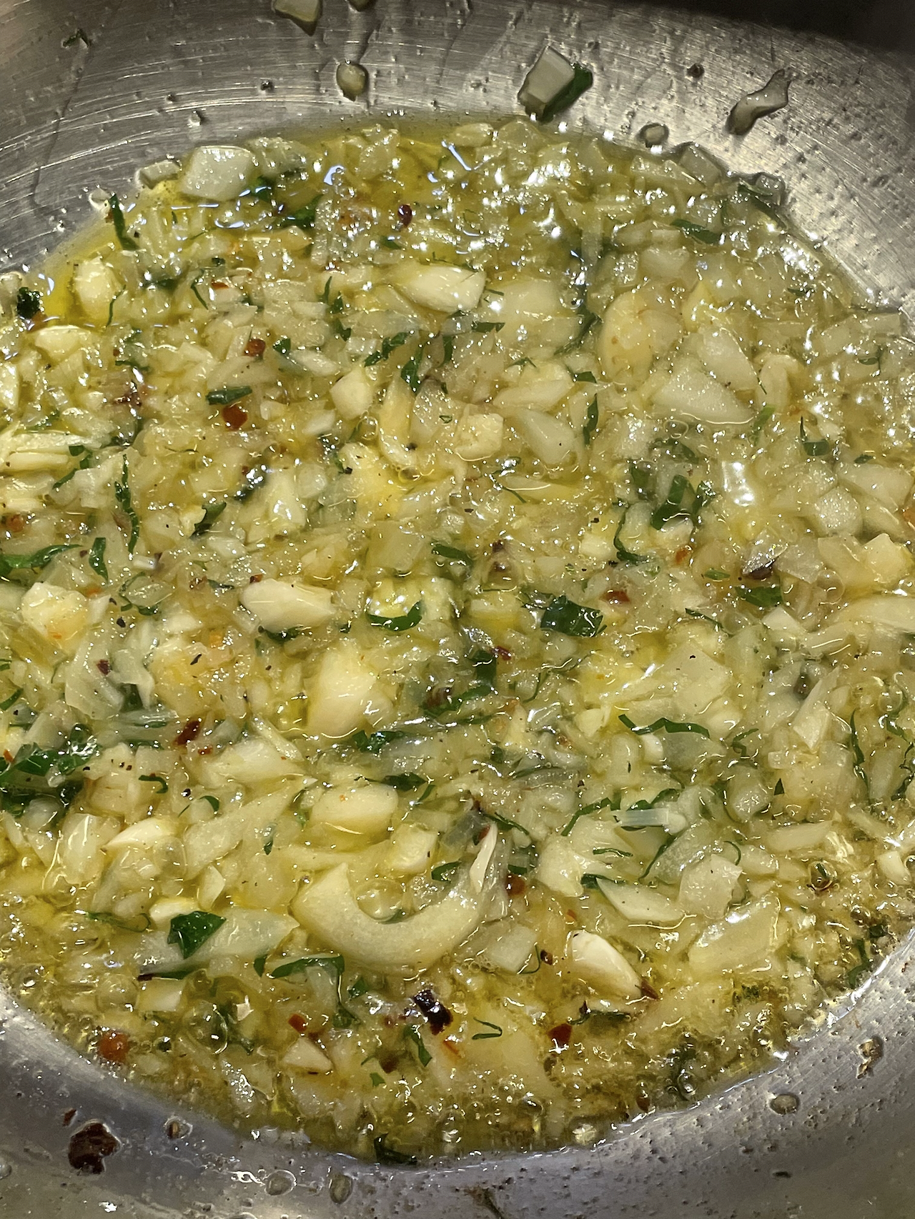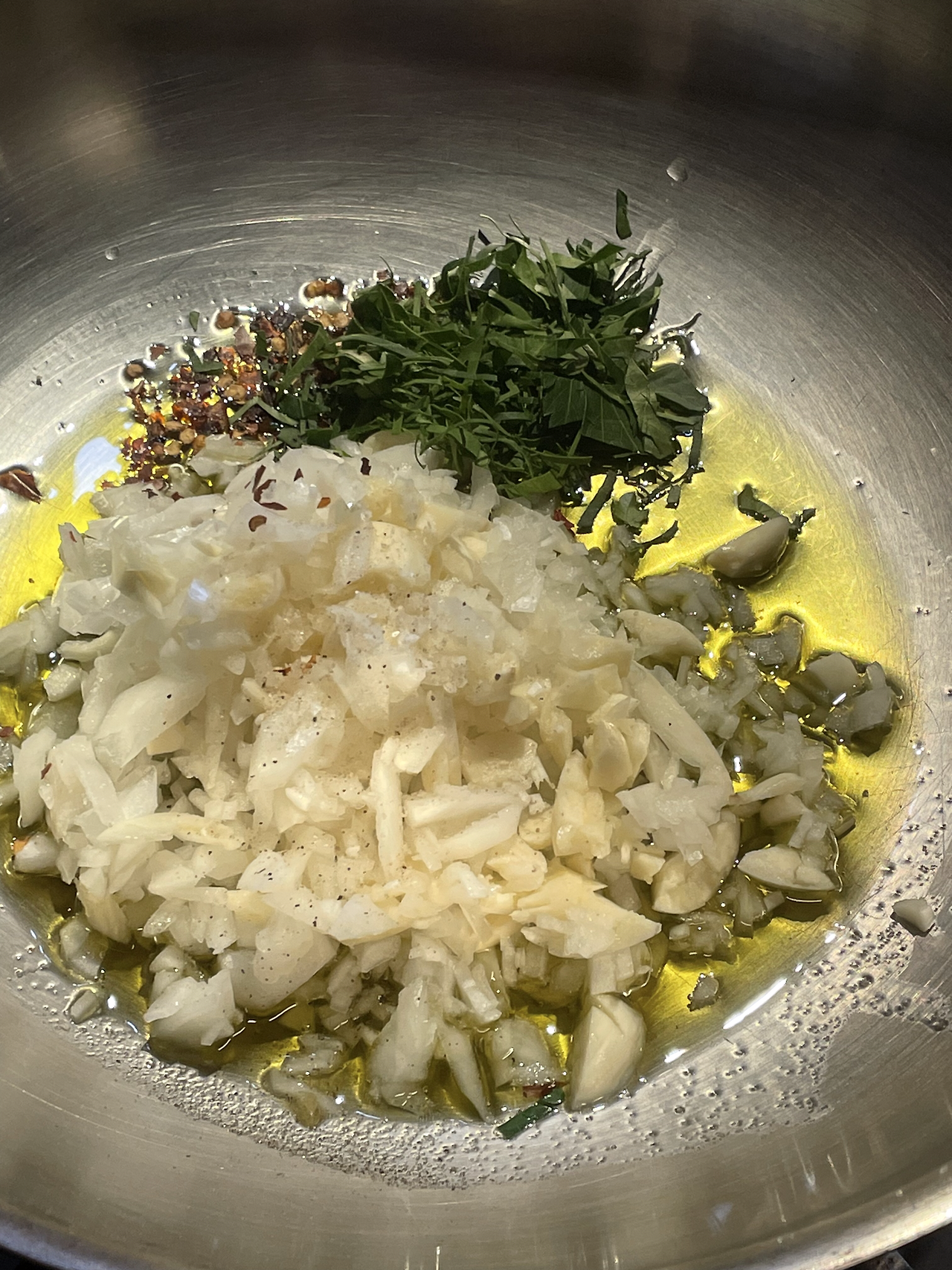 1. 달군 팬에 올리브오일을 두르고 마늘, 양파를 다져 넣어줍니다. 약불로 조리하시구요. 소금 후추와 파슬리, 마른 고추를 적당히 넣어주고 모든 재료가 흐물 해질 때까지 익혀줍니다.