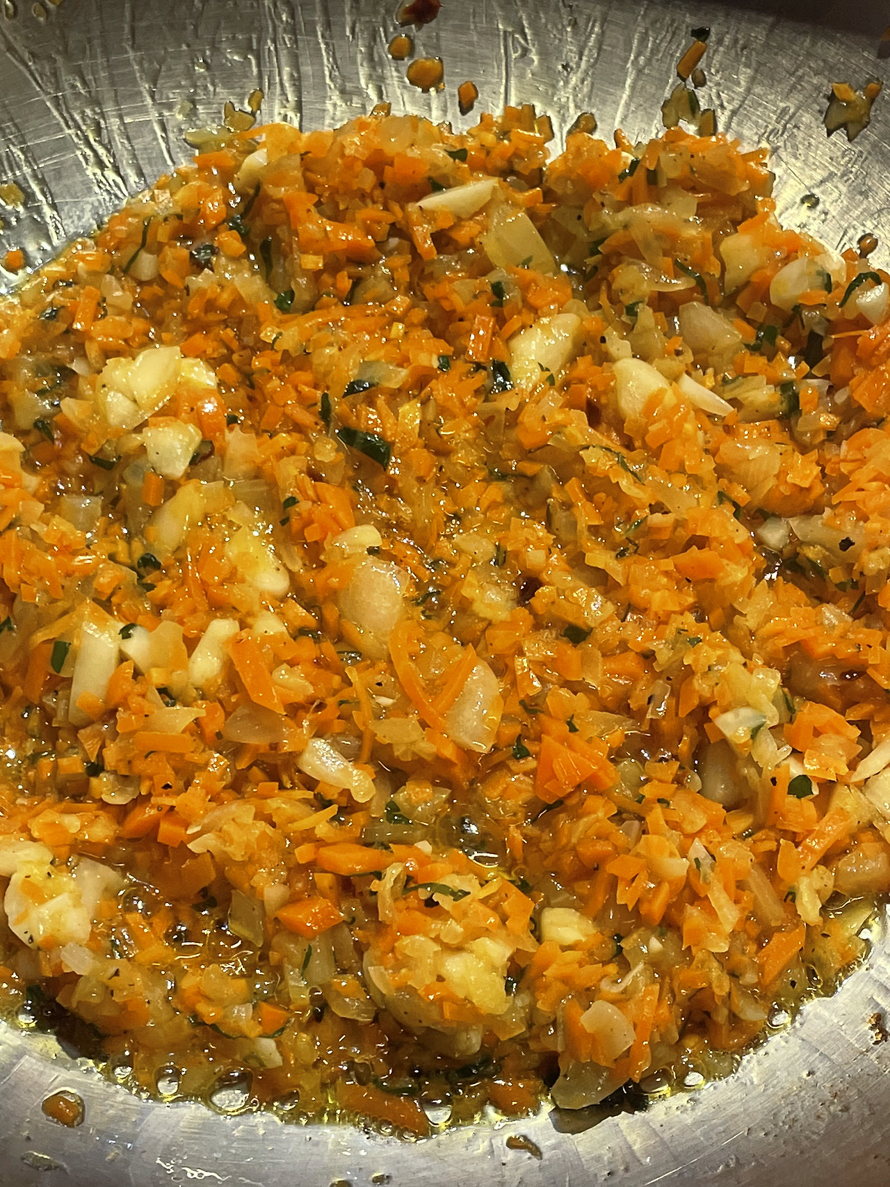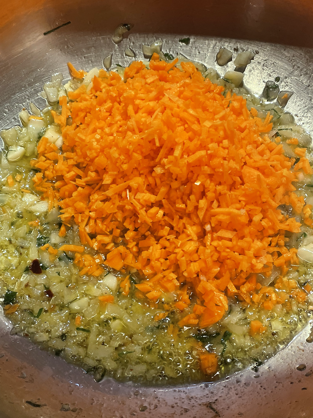 2. 1에 당근과 샐러리를 다져 넣어줍니다. 샐러리가 없다면 생략하셔도 되지만 확실히 들어간 게 향이 좋습니다. 채소의 단맛과 감칠맛을 끝까지 뽑아내기 위해 역시나 약불로 오랫동안 조리합니다.