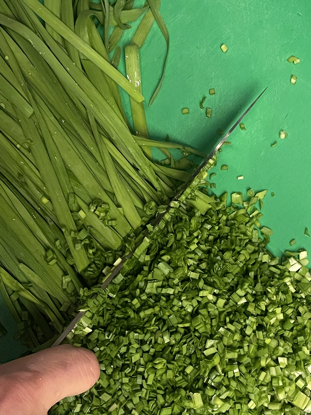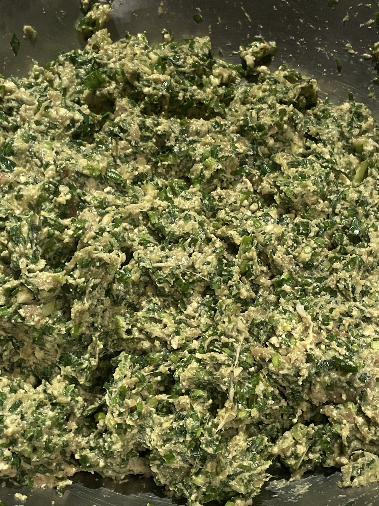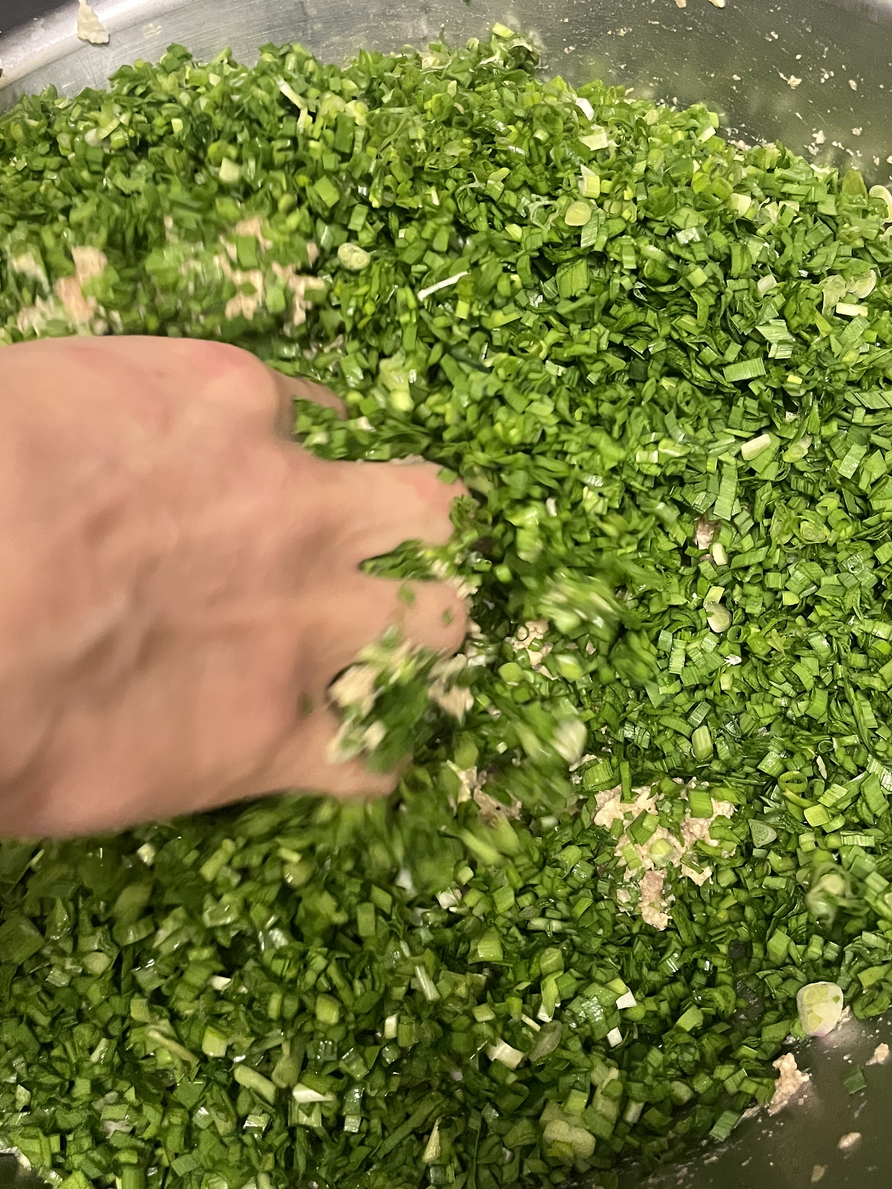 5. 부추와 쪽파는 잘 씻어 물기를 빼준 뒤 송송 썰어 고기 반죽에 더해줍니다. 너무 조물조물하면 채소에서 물이 새어나오니 한 방향으로 휘휘 저어줍니다.