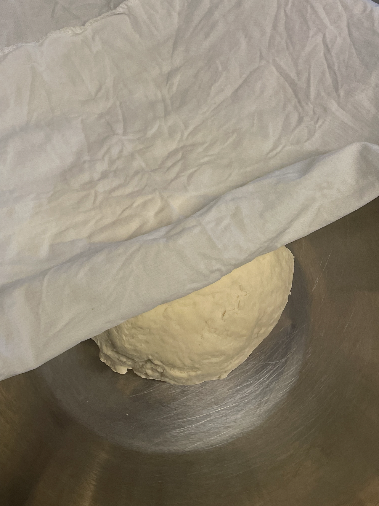 2. 충분히 치댄 반죽에 젖은 면보를 덮어 상온에서 숙성시켜줍니다. 밀가루가 물을 흡수하며 찰기가 더해집니다.