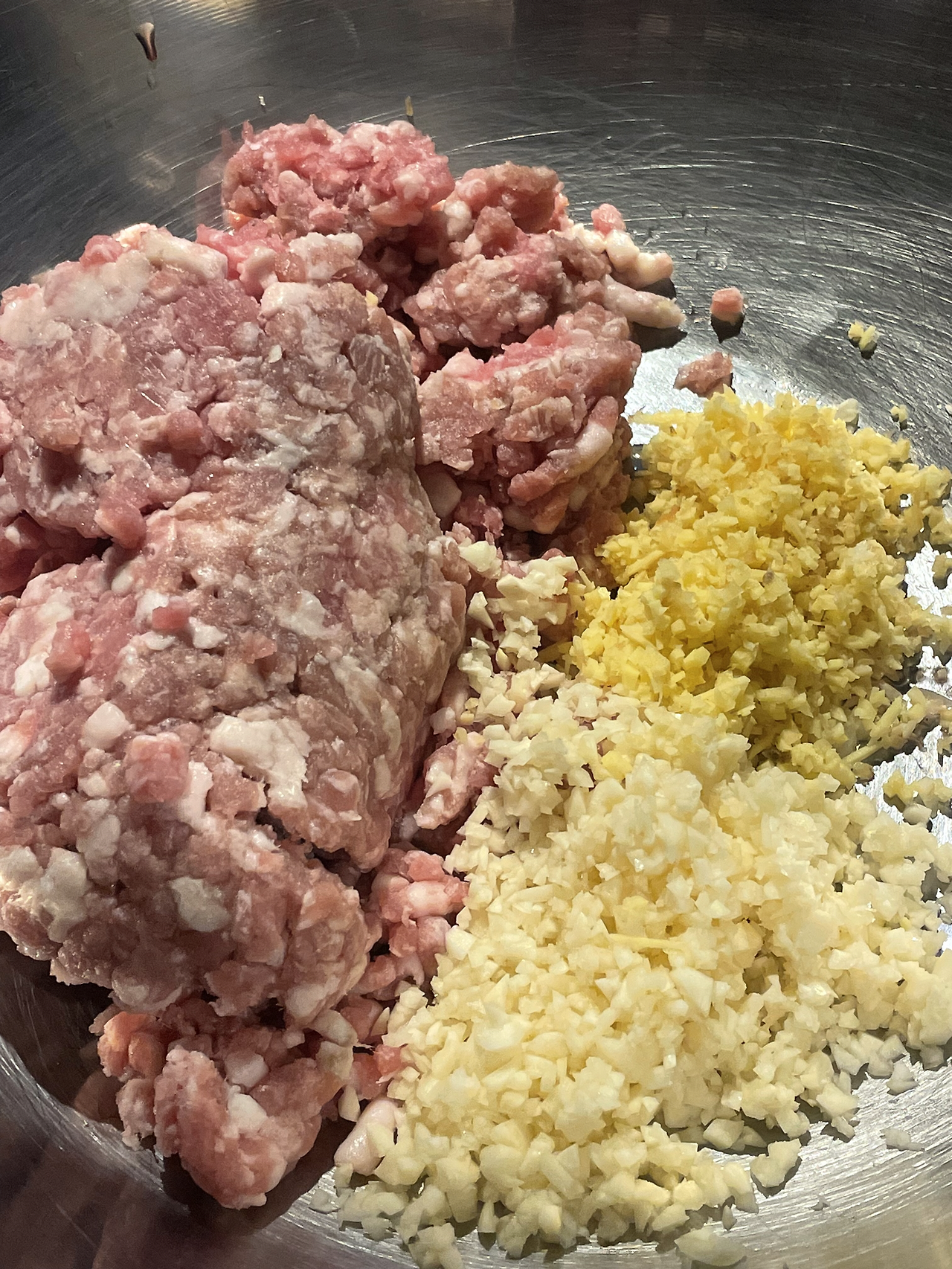 4. 다진 돼지고기와 생강, 마늘, 두부를 넣고 양념에 밑간 해둡니다. 저는 생강과 후추를 좋아해 조금 많이 넣었습니다. 두부는 사진처럼 칼 옆면을 이용해 으깬 뒤 물기를 꼭 짜 넣어줍니다.