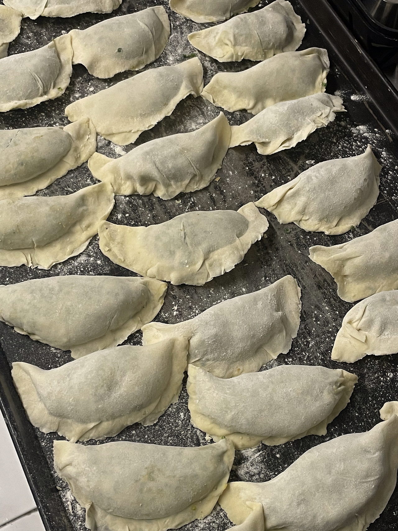 7. 만두피에 소를 든든히 넣고 테두리에 물을 찍어발라 만두를 빚어줍니다. 저희는 초보자라 그런지 모양이 제각각입니다.