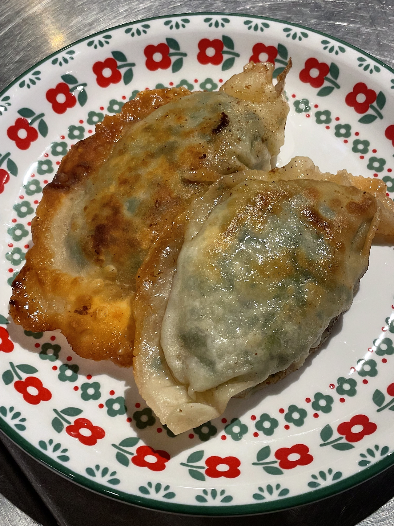 노릇노릇 맛있는 군만두 완성입니다. 중불에 기름을 넉넉히 두르고 겉면을 바삭하게 익힌 후 물을 조금 넣고 뚜껑을 덮어 스팀으로 속까지 익혀줬습니다. 겉바속촉.