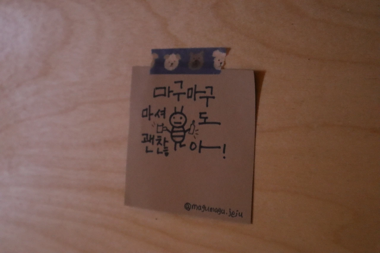 따히 : 제가 마구마구하면서 톨부와 많이 가까워졌어요. 보통 제주도민은 외지에서 온 친구들이 언젠가는 떠날 수도 있다는 걱정이 있는데 최근에 톨부가 부산으로 돌아갈 수도 있다는 이야기를 듣고 마음의 준비를 막 하고 있었어요. 너무 슬픈 거예요. 그때 연말파티 때 집에 가는 길에 톨부가 편지를 써 줬는데 제가 걱정하던 부분을 톨부가 잘 집어 가지고 풀어서 이야기를 해준 거예요. 읽는데 눈물이 막…아 보여드릴게요. 오열의 현장.