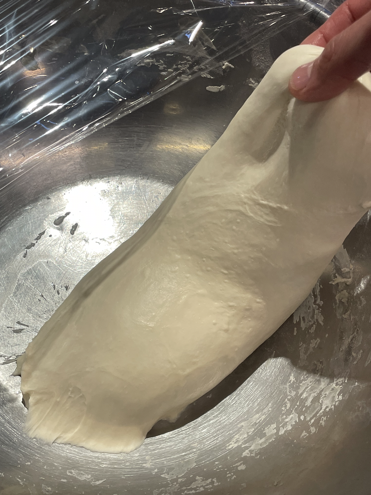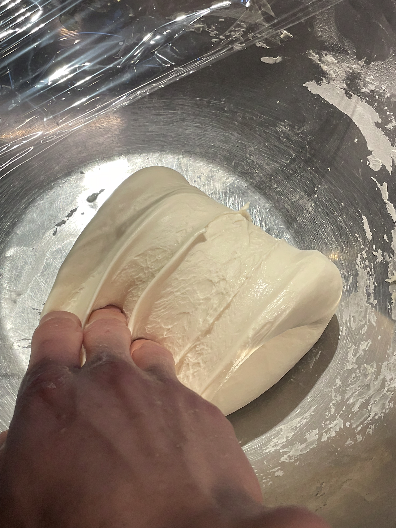 4. 30분 후 밀가루가 물을 흡수하는 수화(Hydrating)가 일어나 조금 더 매끈해졌습니다. 손에 물을 묻히고 반죽을 두어 번 조심스레 접어 준 뒤 다시 밀봉해 30분간 둡니다. 이 과정을 세 번 반복합니다.