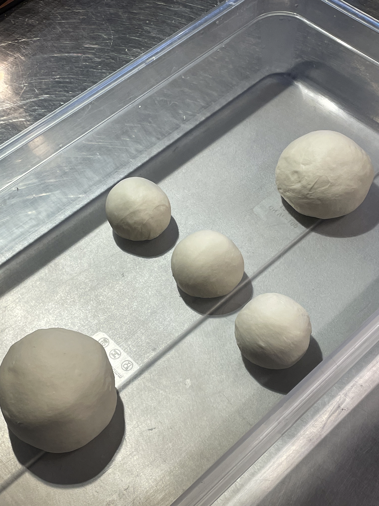 6. 필요한 양만큼 떼어내 기포가 날아가지 않게 둥그렇게 말아 적절한 용기에 담고 냉장고에서 하룻밤 발효시킵니다. 실온에서 발효할 경우 3시간 정도 후 사용가능합니다. 저는 피타프래드 3개와 작은 피자 1개 포카치아 1개를 만들 양으로 소분했습니다.