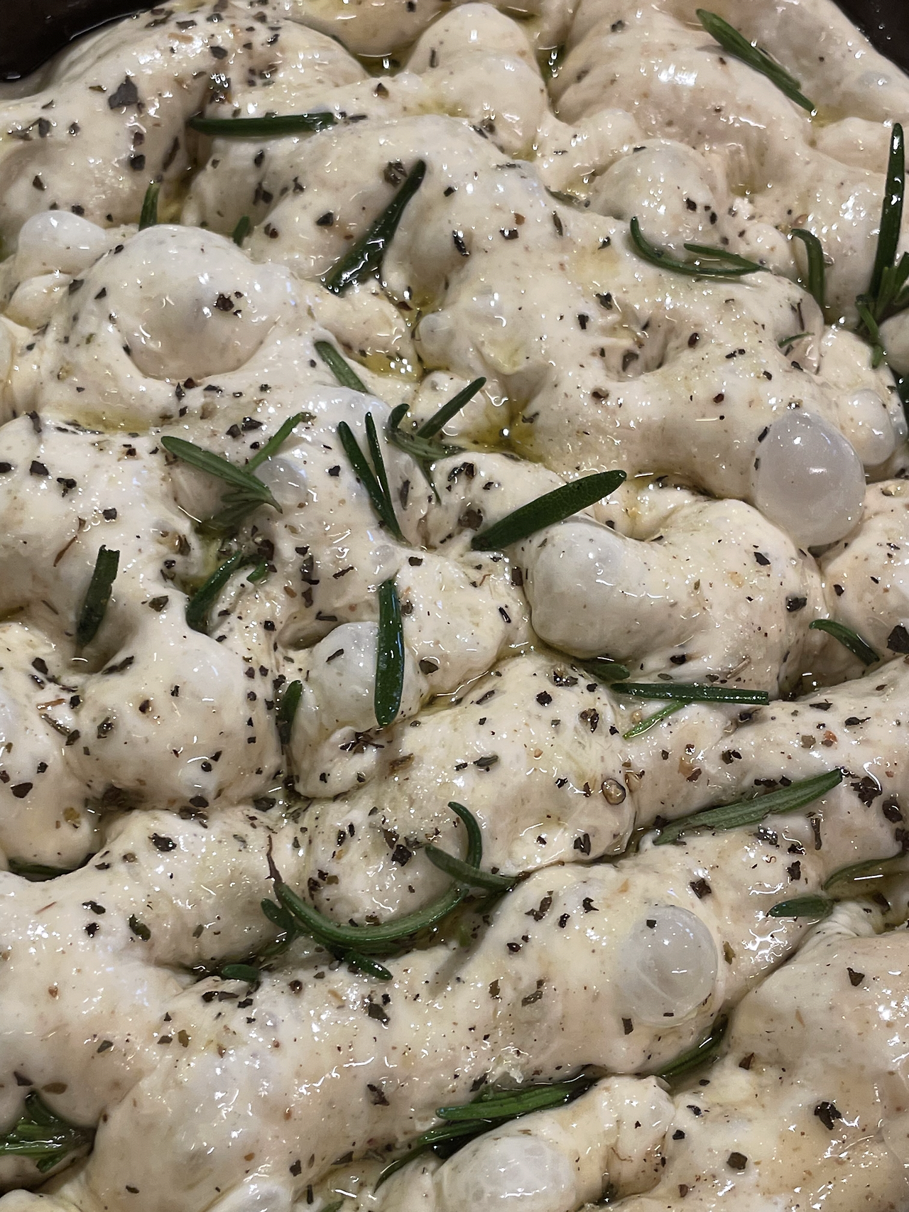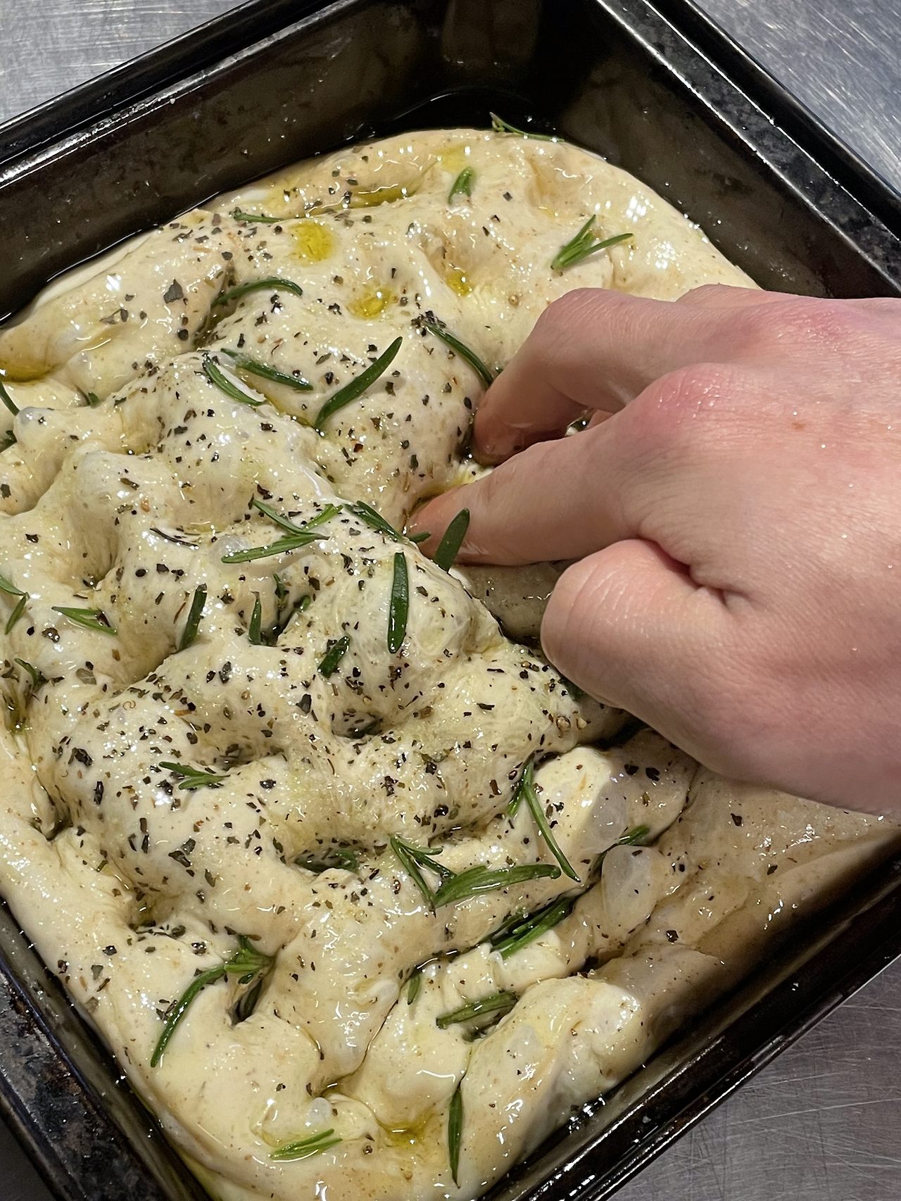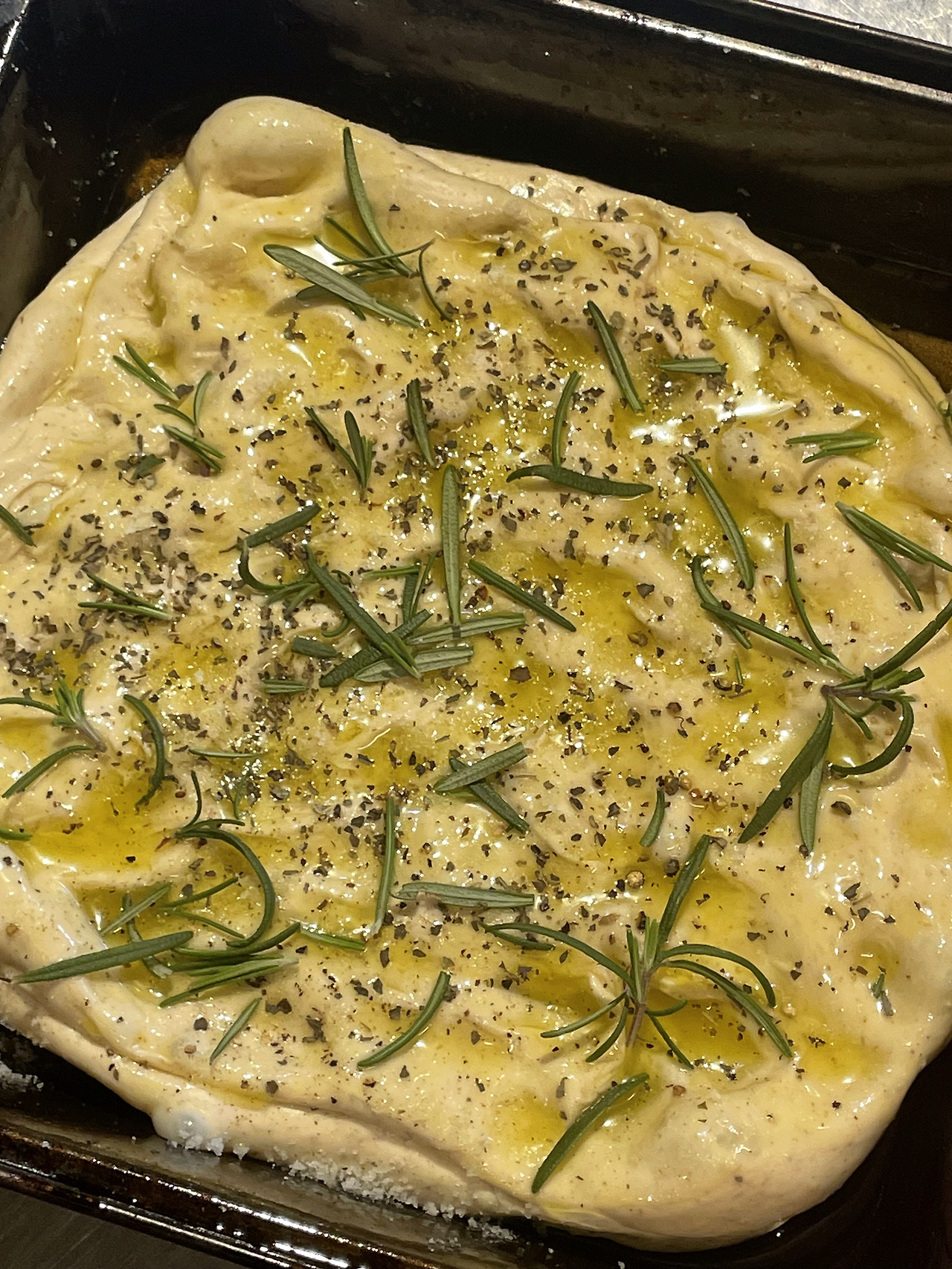 1. 만능반죽 500g을 올리브오일을 넉넉히 두른 팬에 넣고 소금과 후추, 올리브오일, 로즈마리를 올려 꾹꾹 눌러준 뒤 밀봉해 실온에서 1시간 이상 두어줍니다. 기호에 따라 토마토, 올리브, 바질 등 좋아하는 재료를 추가해 줍니다. 저는 뒷마당에서 자생하는 로즈마리를 이용했습니다.