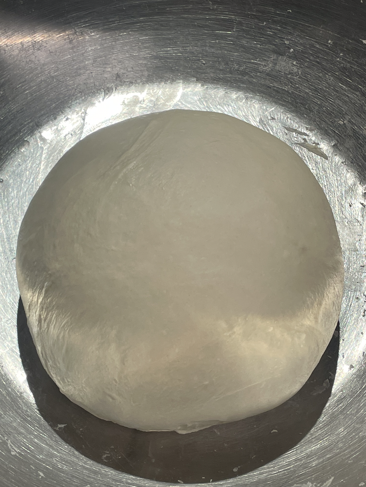 3. 5분간 열심히 치대면 약간 끈적한 상태의 밀가루 반죽이 되는데 그릇에 넣고 수분이 날아가지 않게 잘 밀봉한 뒤 실온에 30분간 둡니다.