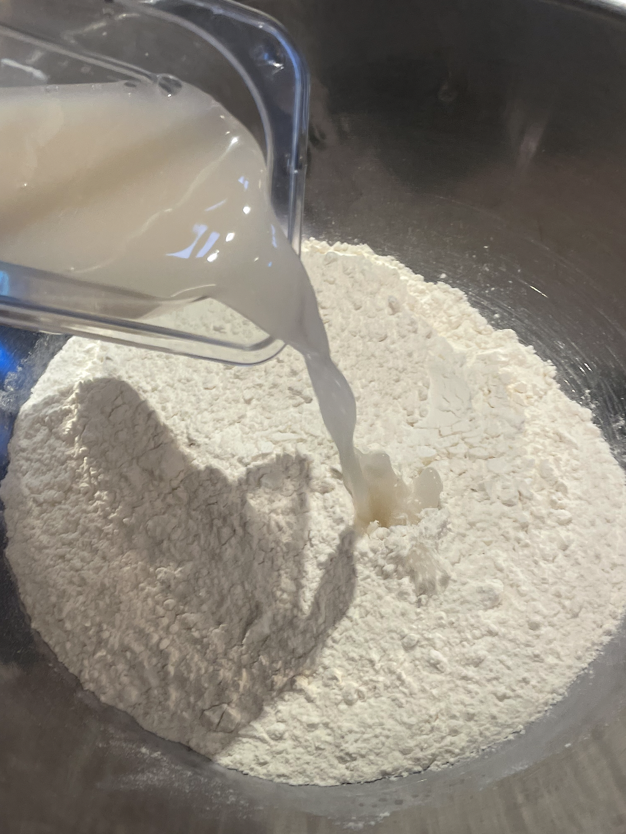 2. 계량한 밀가루에 1을 넣고 반죽을 시작합니다.