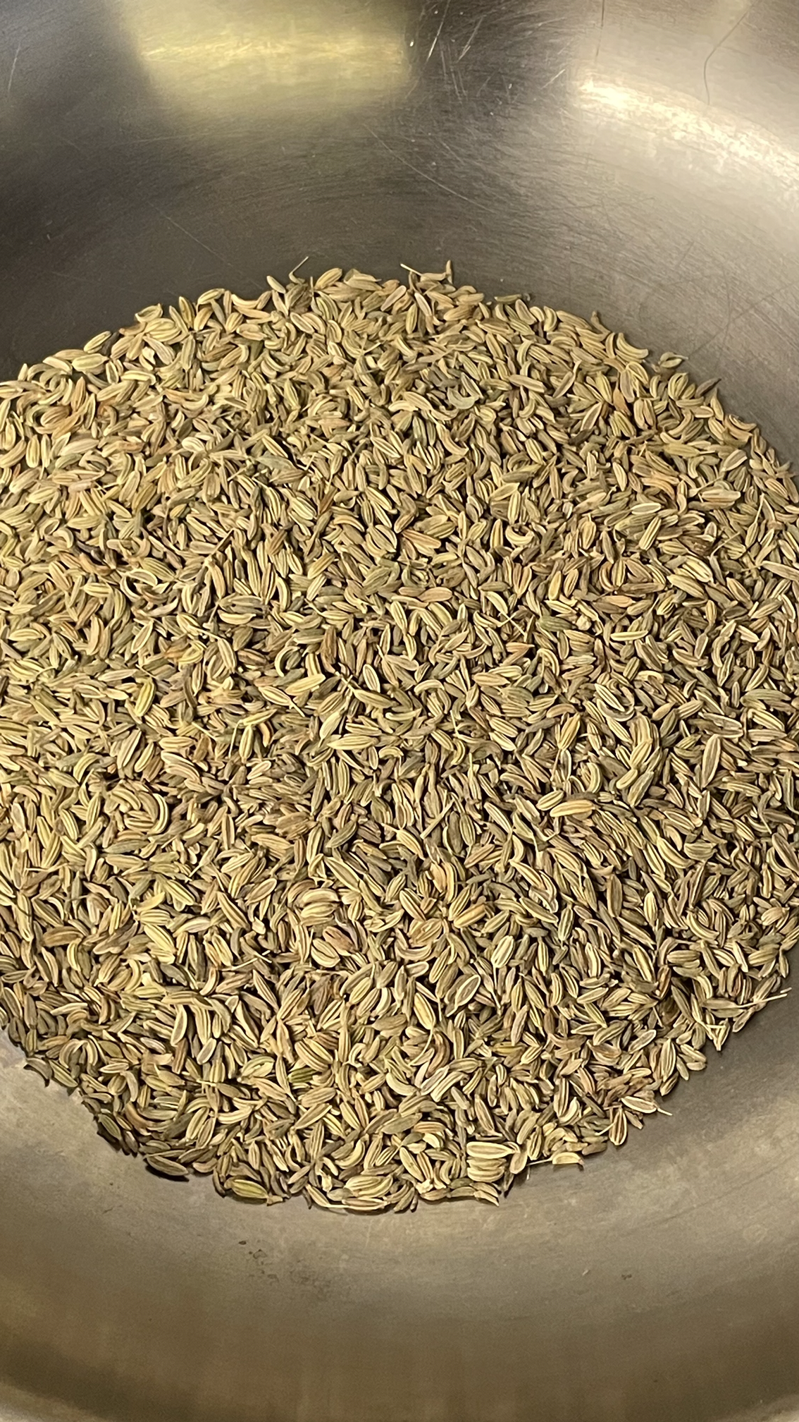 1. 우선 펜넬씨앗을 달군 팬에서 덖어줍니다. 색과 향이 올라오면 불을 끄고 대기시켜 놓습니다.