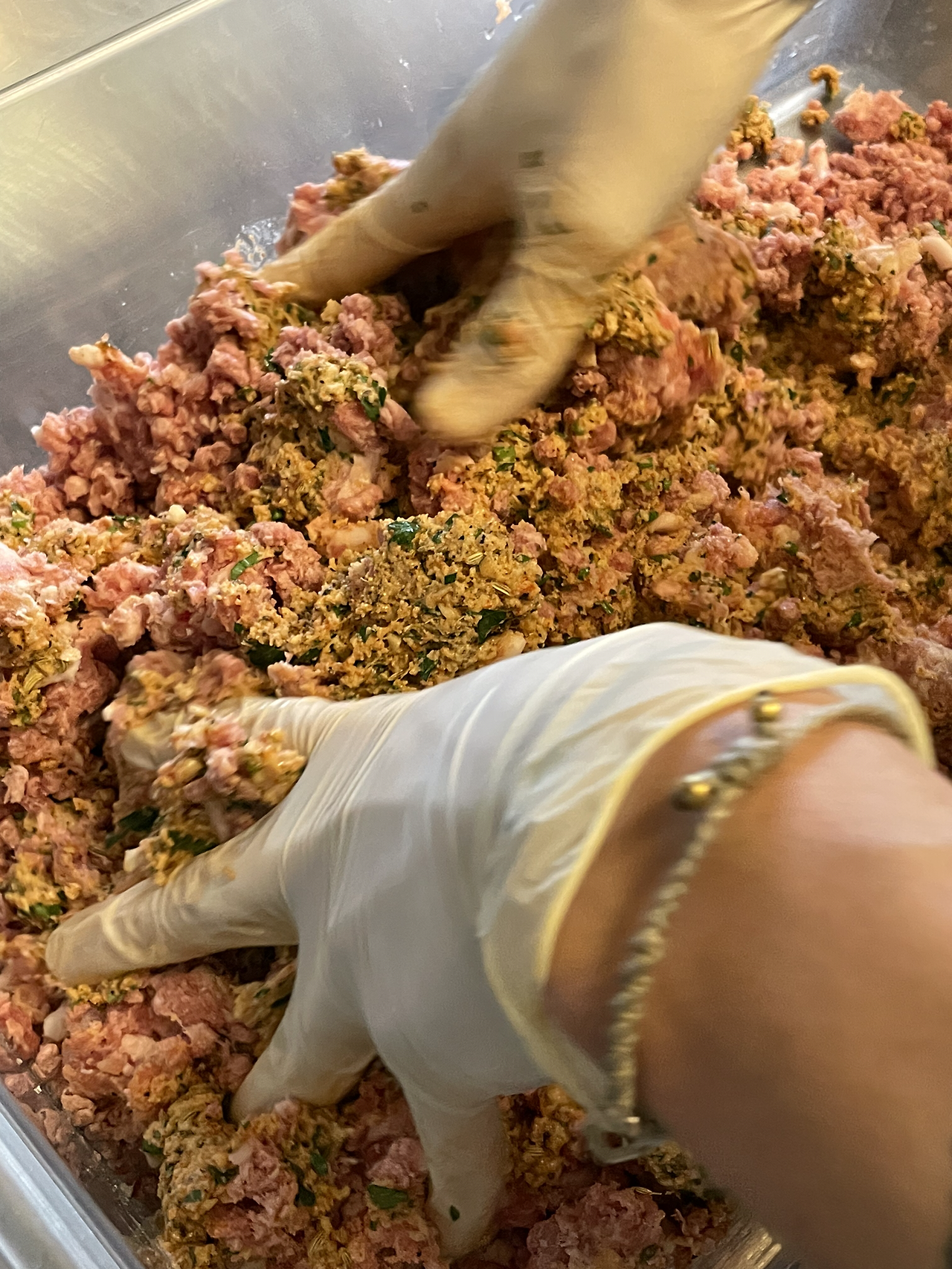 3. 두 가지 고기와 2 양념을 넣고 잘 섞어줍니다. 이대로 하룻밤정도 두면 맛이 균질해지고 뭉치기가 수월해집니다.