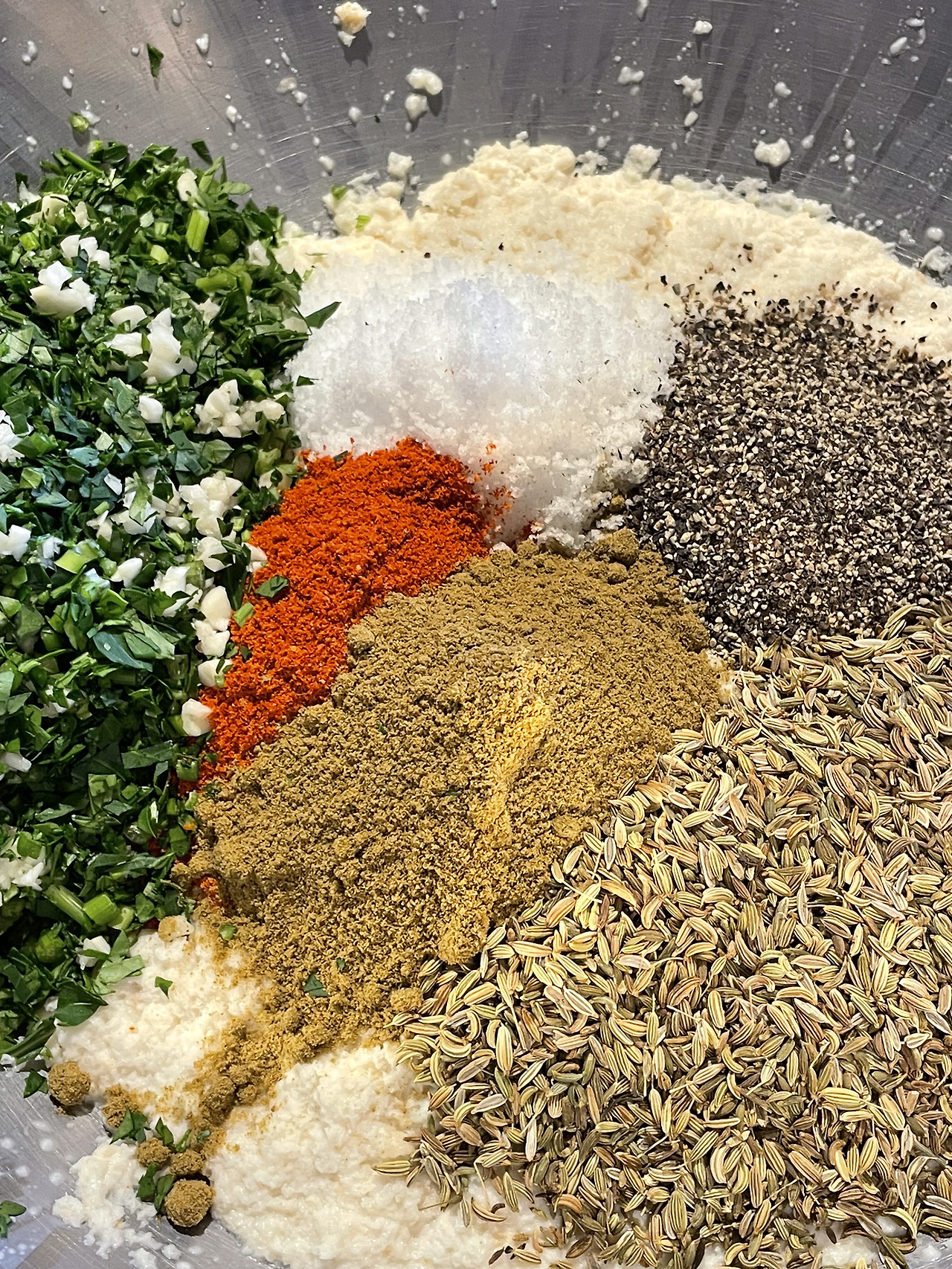 2. 빵가루에 우유를 붓고 촉촉하게 풀어둡니다. 그 이후에 고기를 제외한 모든 재료를 넣고 잘 섞어 양념을 만들어줍니다. 파슬리와 마늘은 곱게 다져주세요.