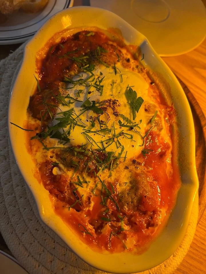 5. 4화의 당근토마토소스 세 국자와 미트볼 5개를 팬에서 지글지글 졸여줍니다. 용기에 옮겨 담아 달걀을 하나 깨넣고 전자레인지에 4분간 돌려 샥슈카를 완성합니다. 파슬리와 후추로 마무리! 5화의 만능반죽을 이용한 빵과도 잘 어울립니다.