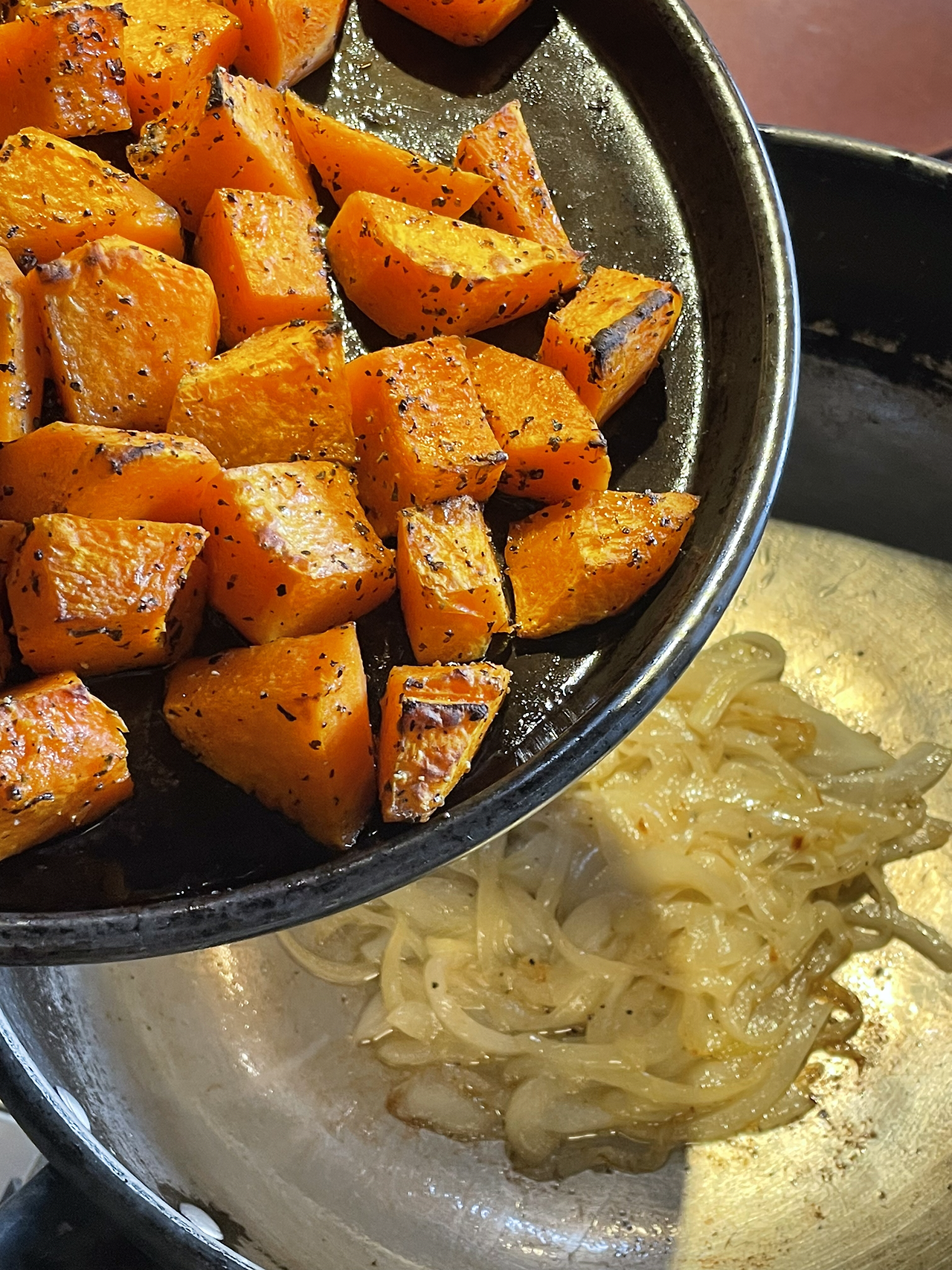 4. 양파가 흐물흐물해지면 구운 호박을 넣고 살짝 볶아줍니다.