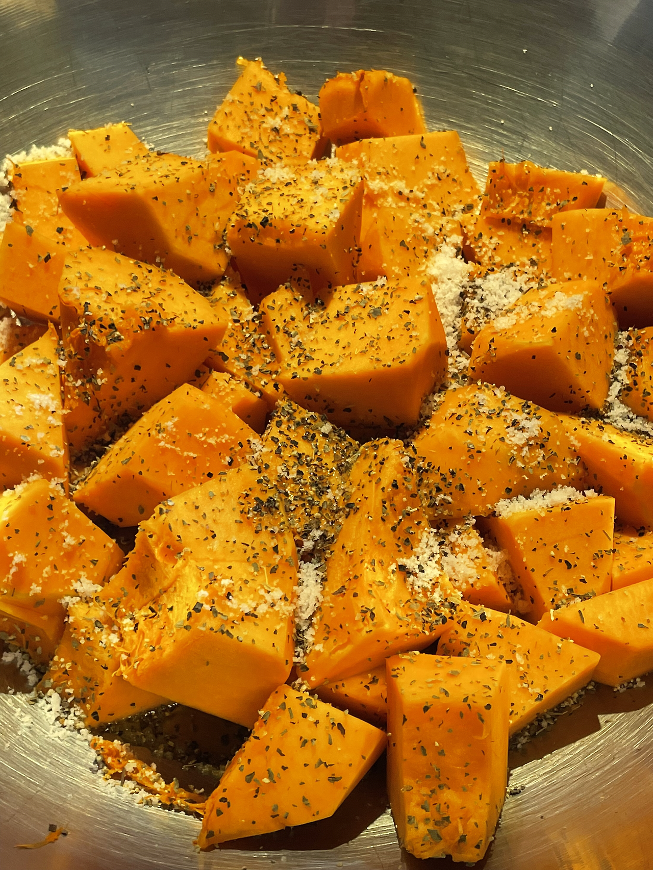 1. 늙은 호박은 껍질과 씨앗을 제거한 뒤 듬성듬성 썰어 소금, 후추, 바질, 올리브오일을 둘러 잘 섞어줍니다. (호박씨는 따로 모아 간식으로 사용합니다)