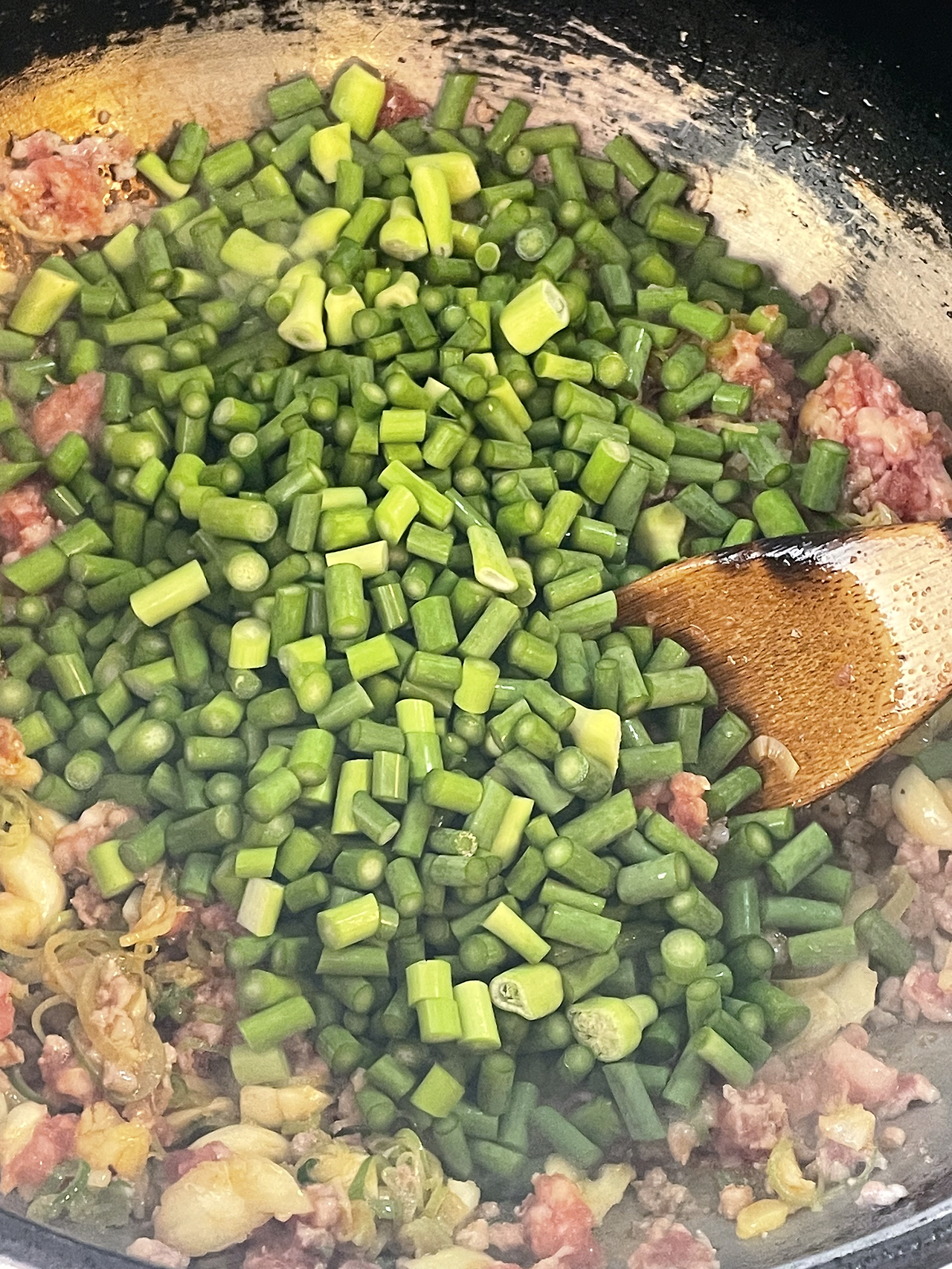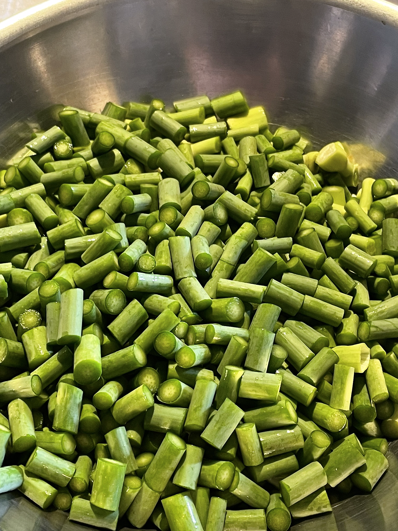 4. 잘게 자른 마늘종을 넣고 센 불에서 살짝 볶아줍니다.
