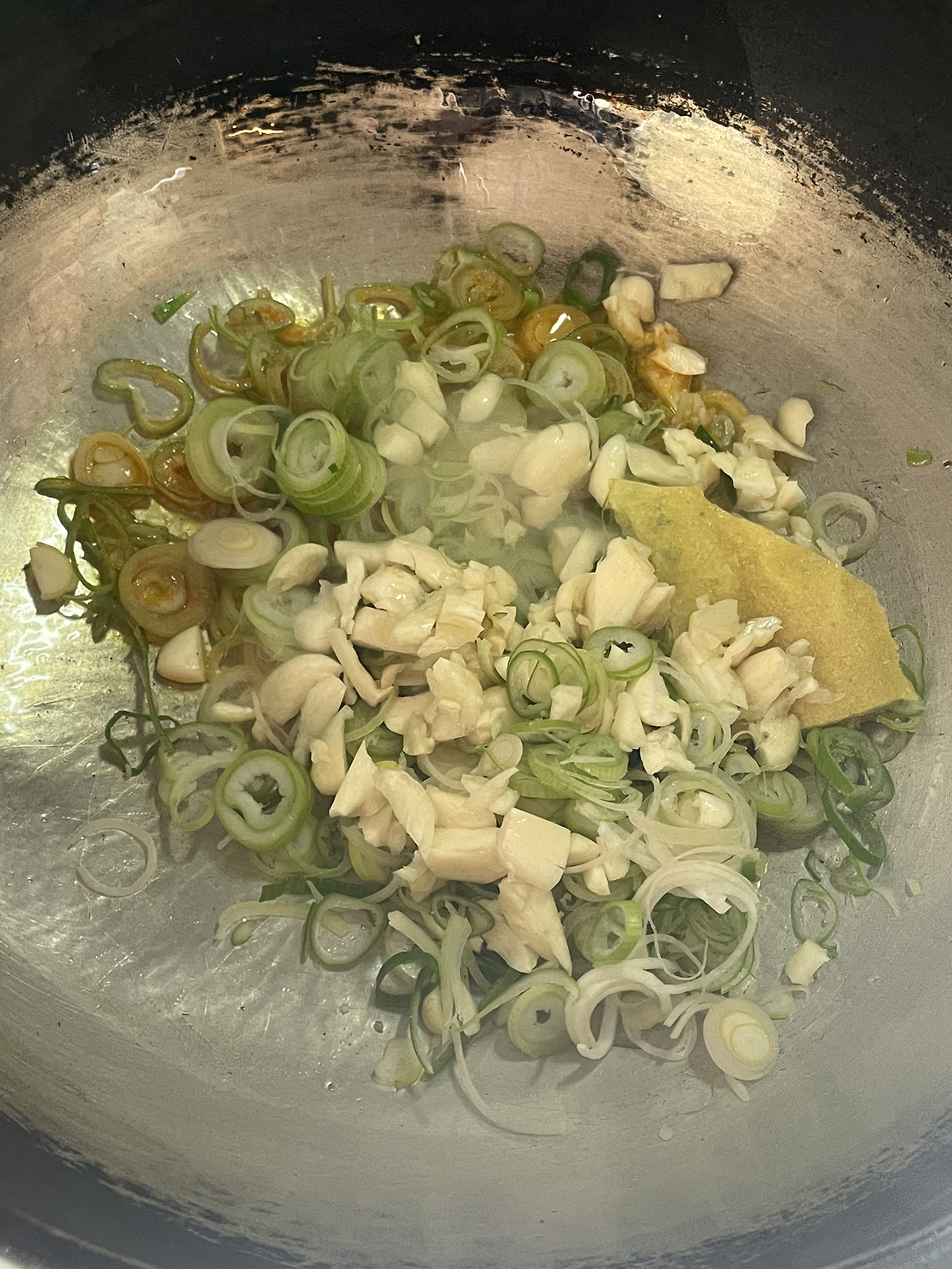2. 뜨겁게 달군 팬에 고추기름을 두르고 1의 채소를 몽땅 넣어 센 불에 볶아줍니다.