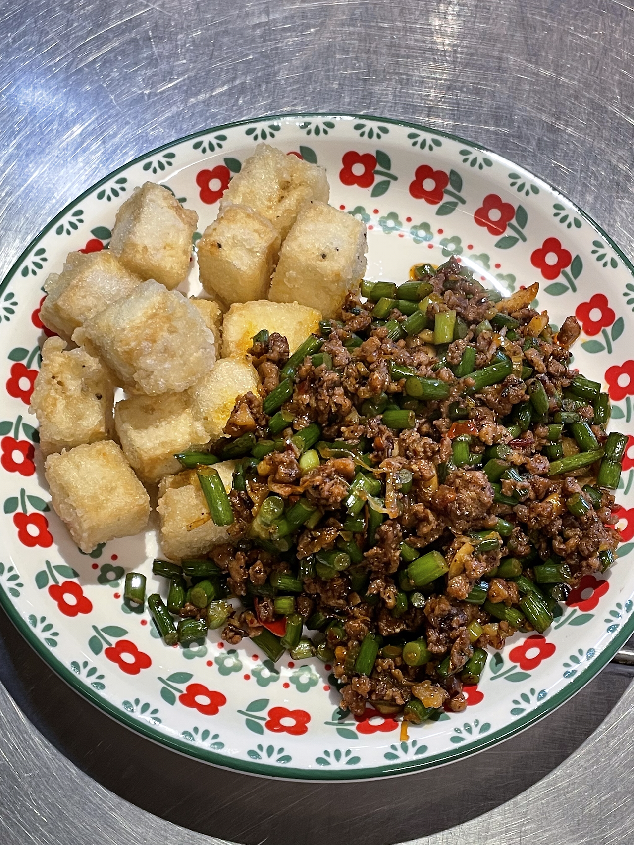 완성입니다. 저는 전분을 발라 튀긴 두부와 함께 담았습니다. 따듯한 밥 한 공기 뚝딱!