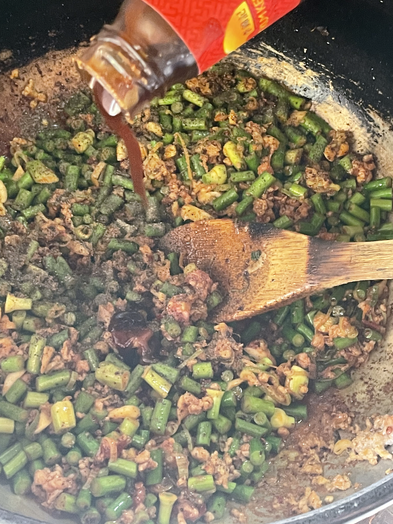 7. 팬이 살짝 탈 때까지 볶아주다가 간장과 굴소스를 넣고 아주 약간만 더 볶아줍니다. 진간장을 사용해도 좋습니다.
