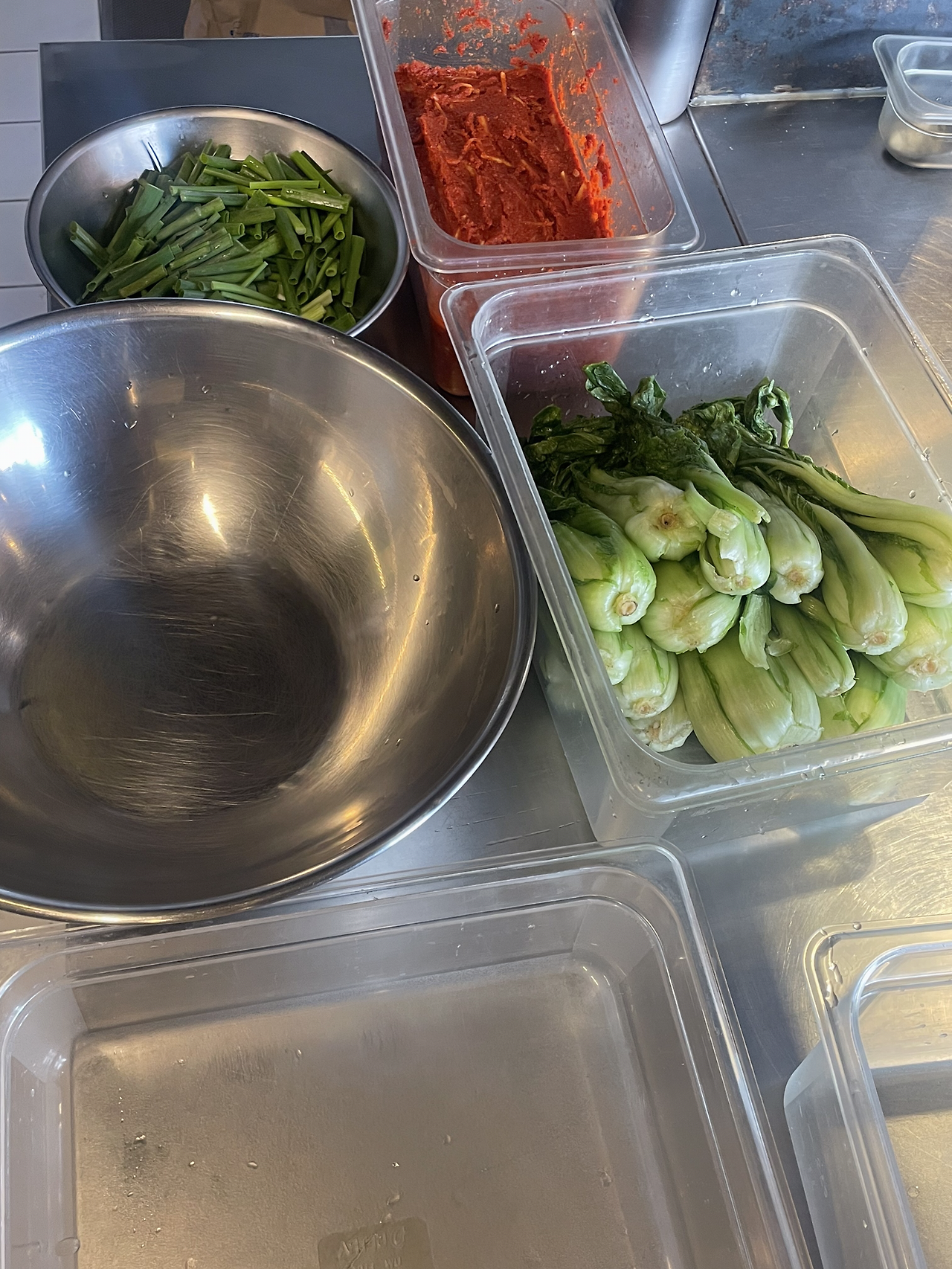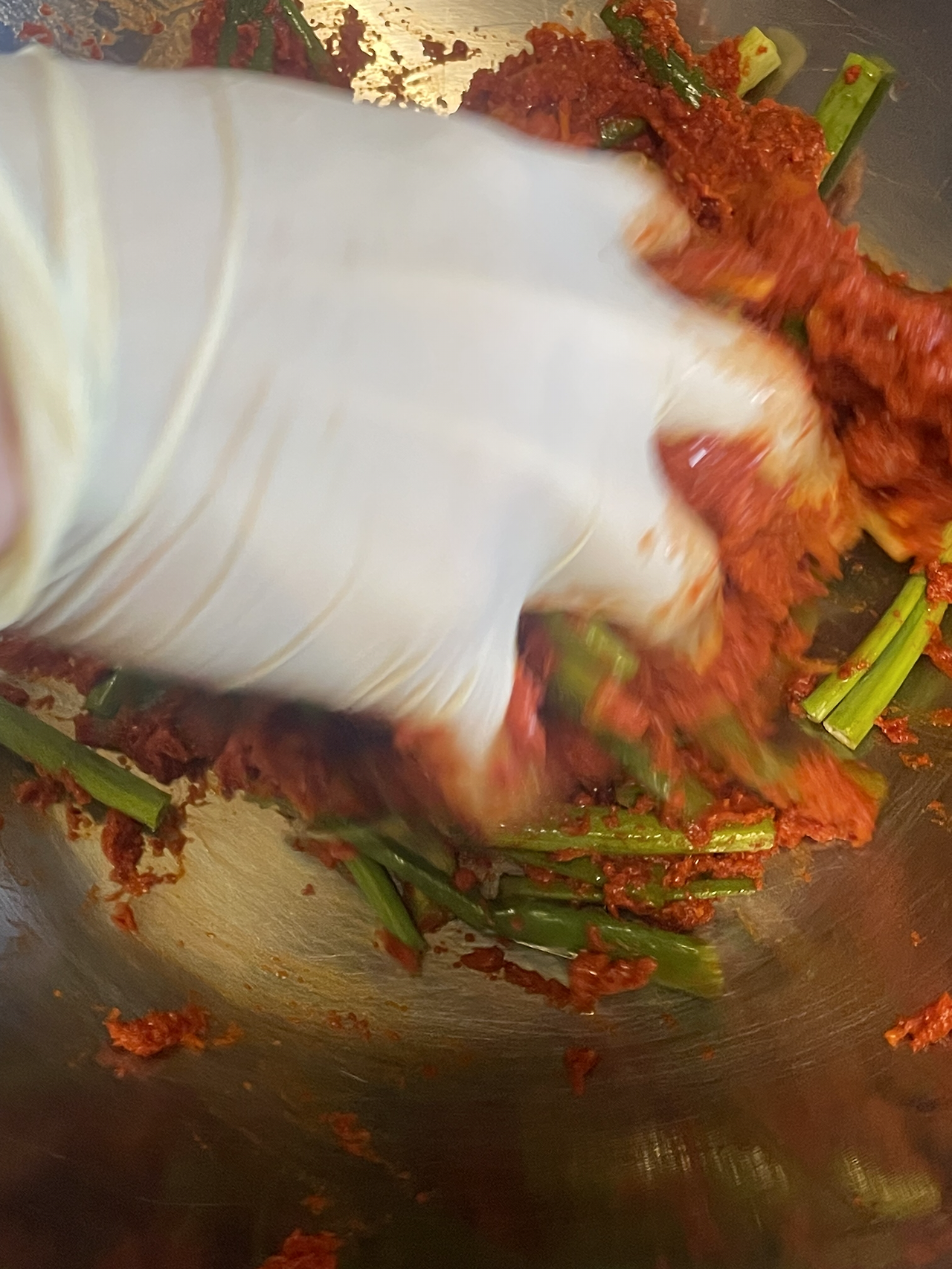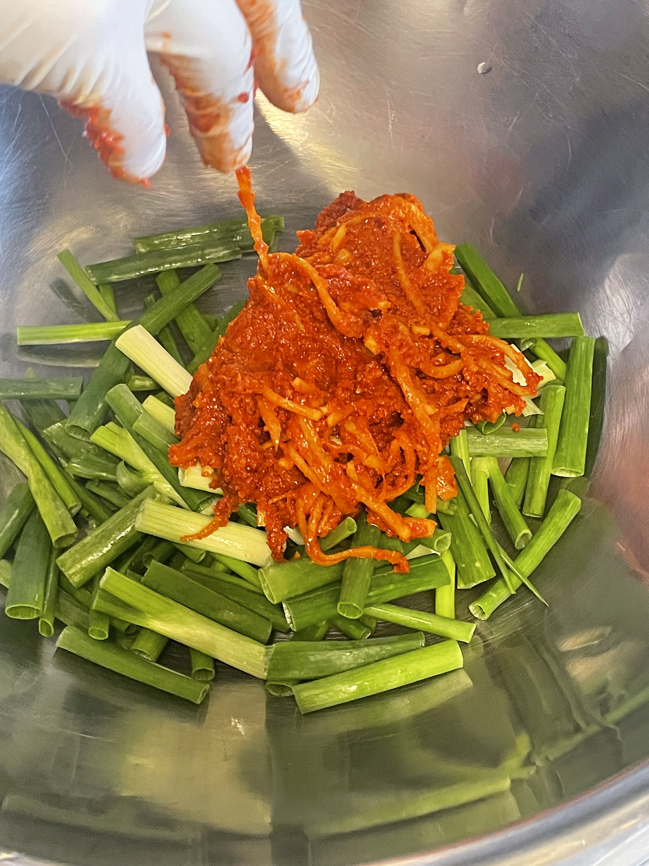 5. 쪽파를 썰어 숙성한 김칫소와 버무려줍니다.