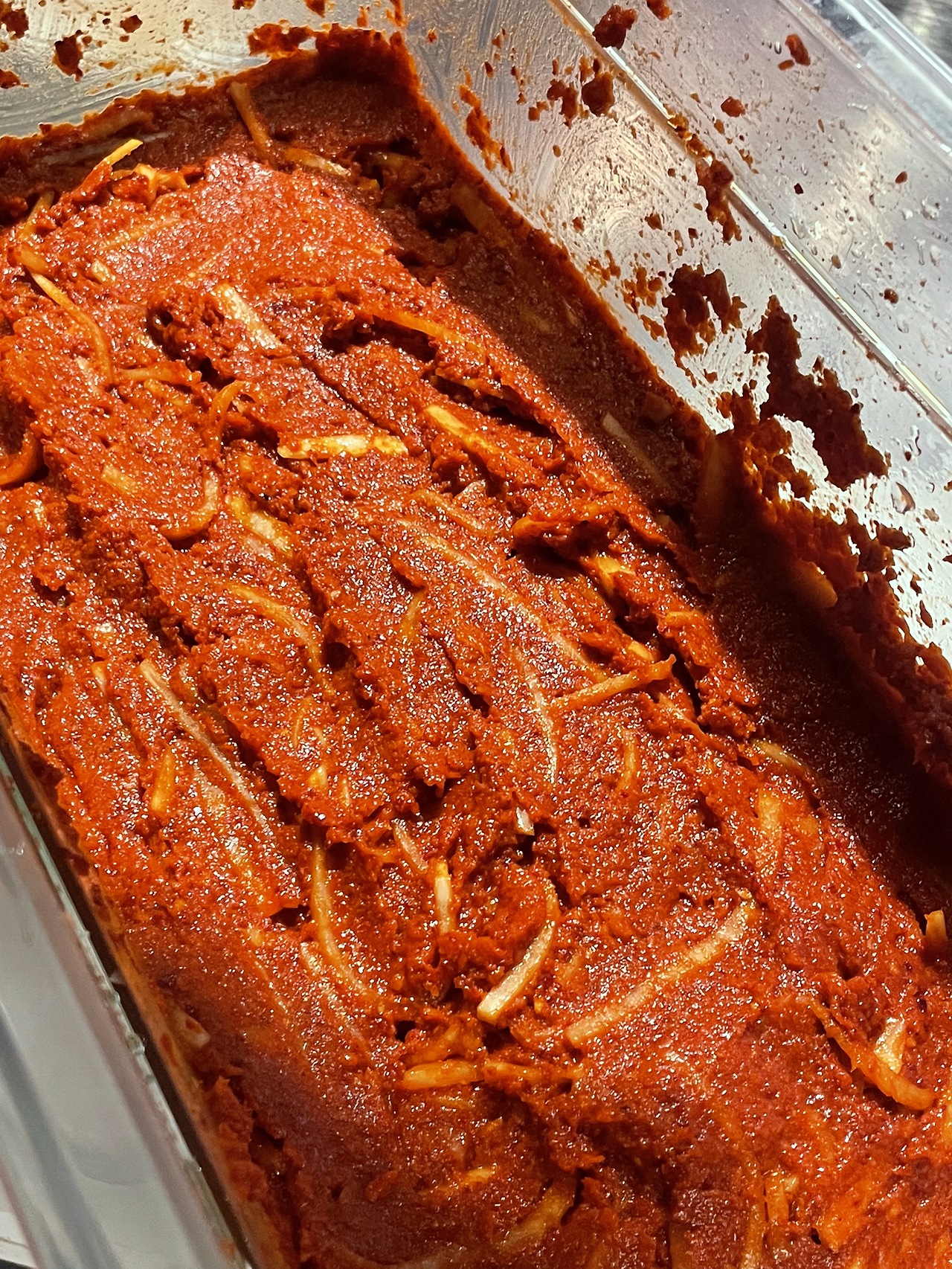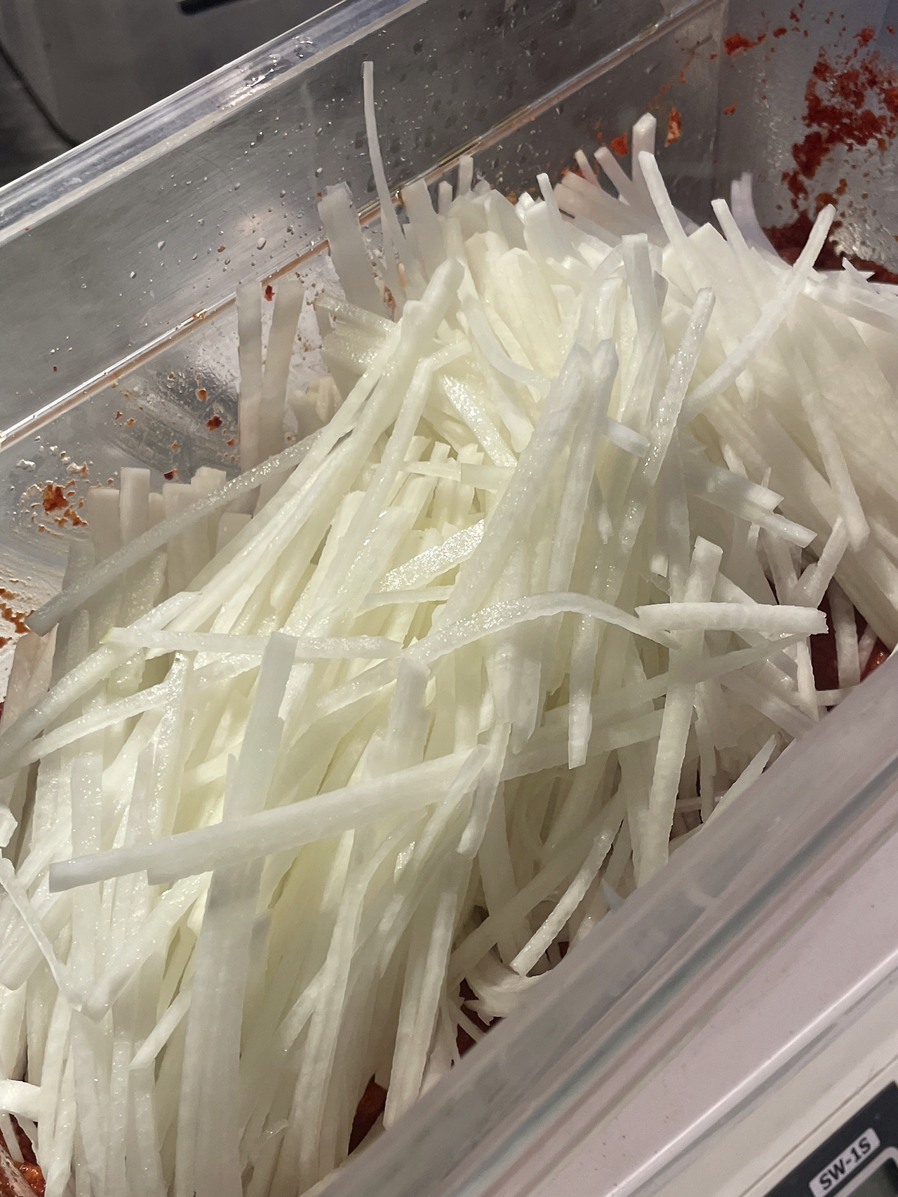 3. 고춧가루를 넣고 잘 섞어준 뒤 무채를 넣고 하루정도 숙성시켜 줍니다.