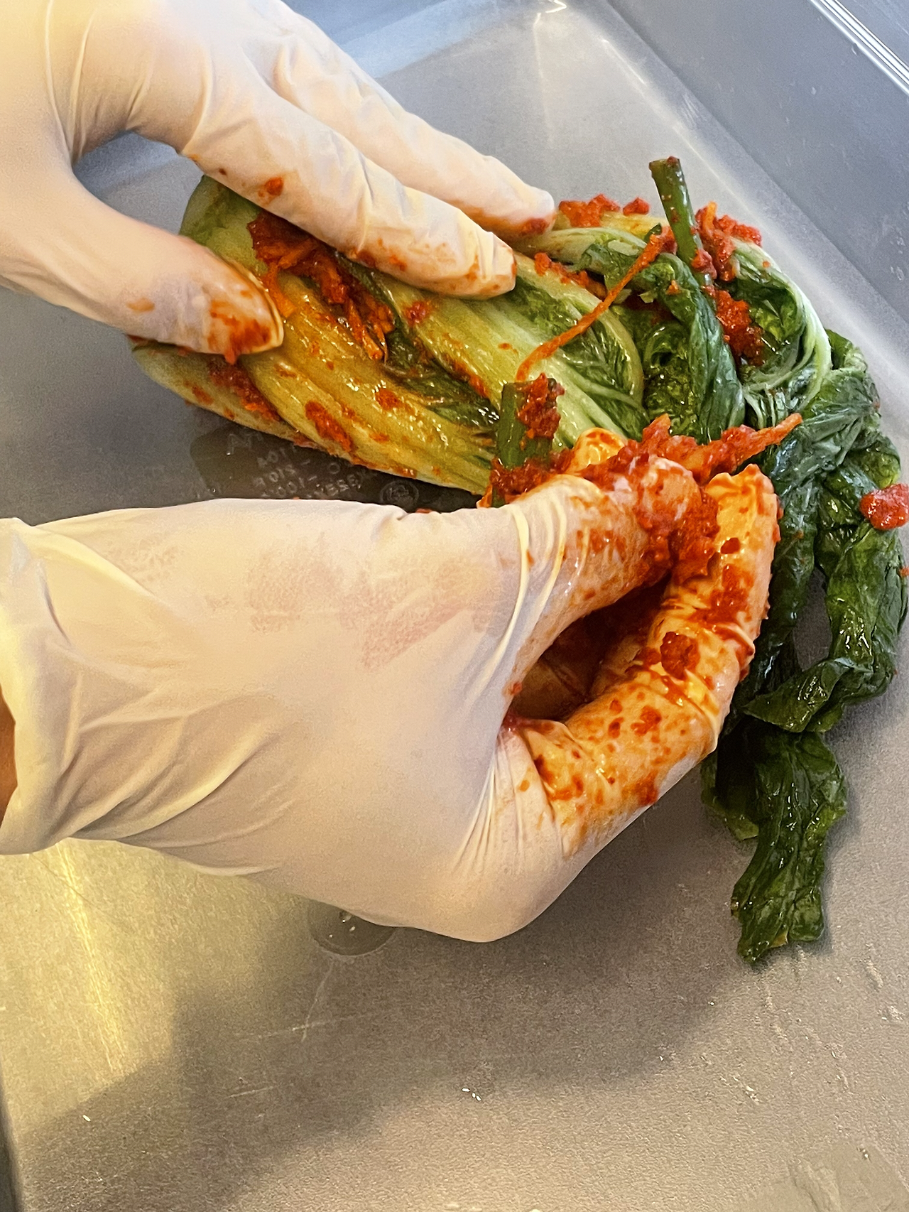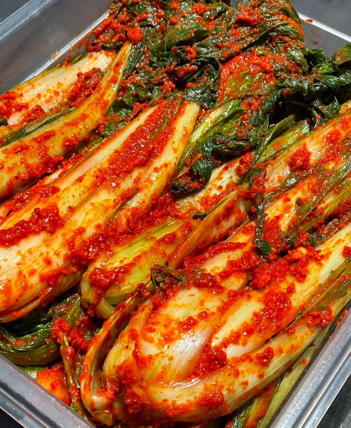 6. 배추의 속까지 꼼꼼히 소를 발라 적절한 용기에 담아 보관합니다.