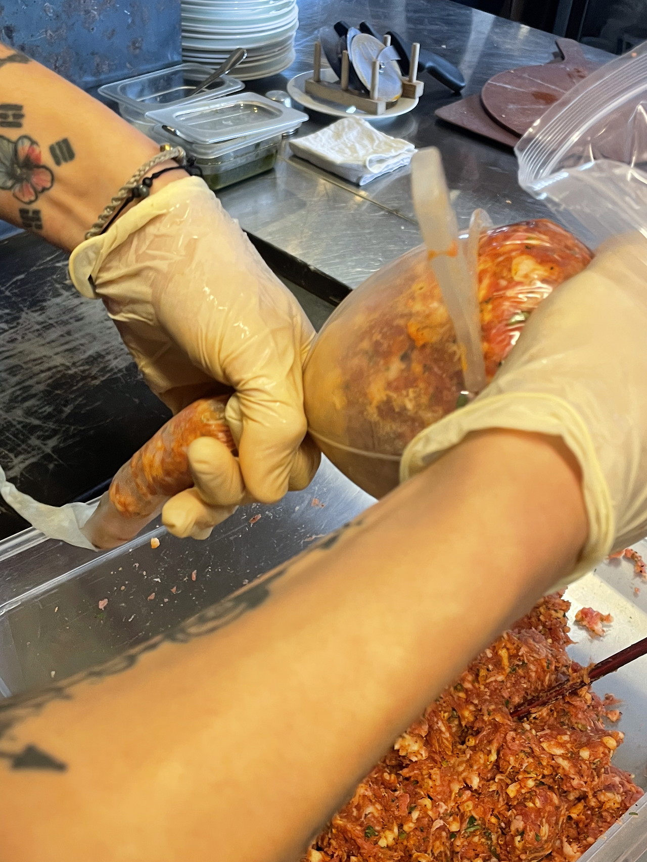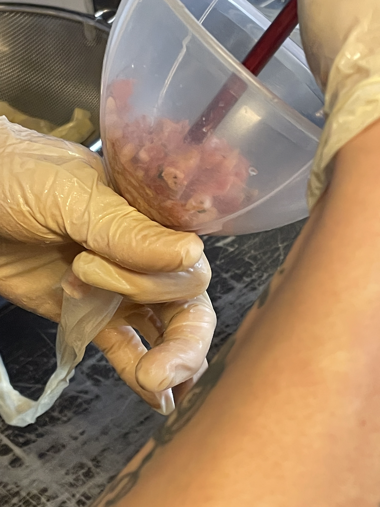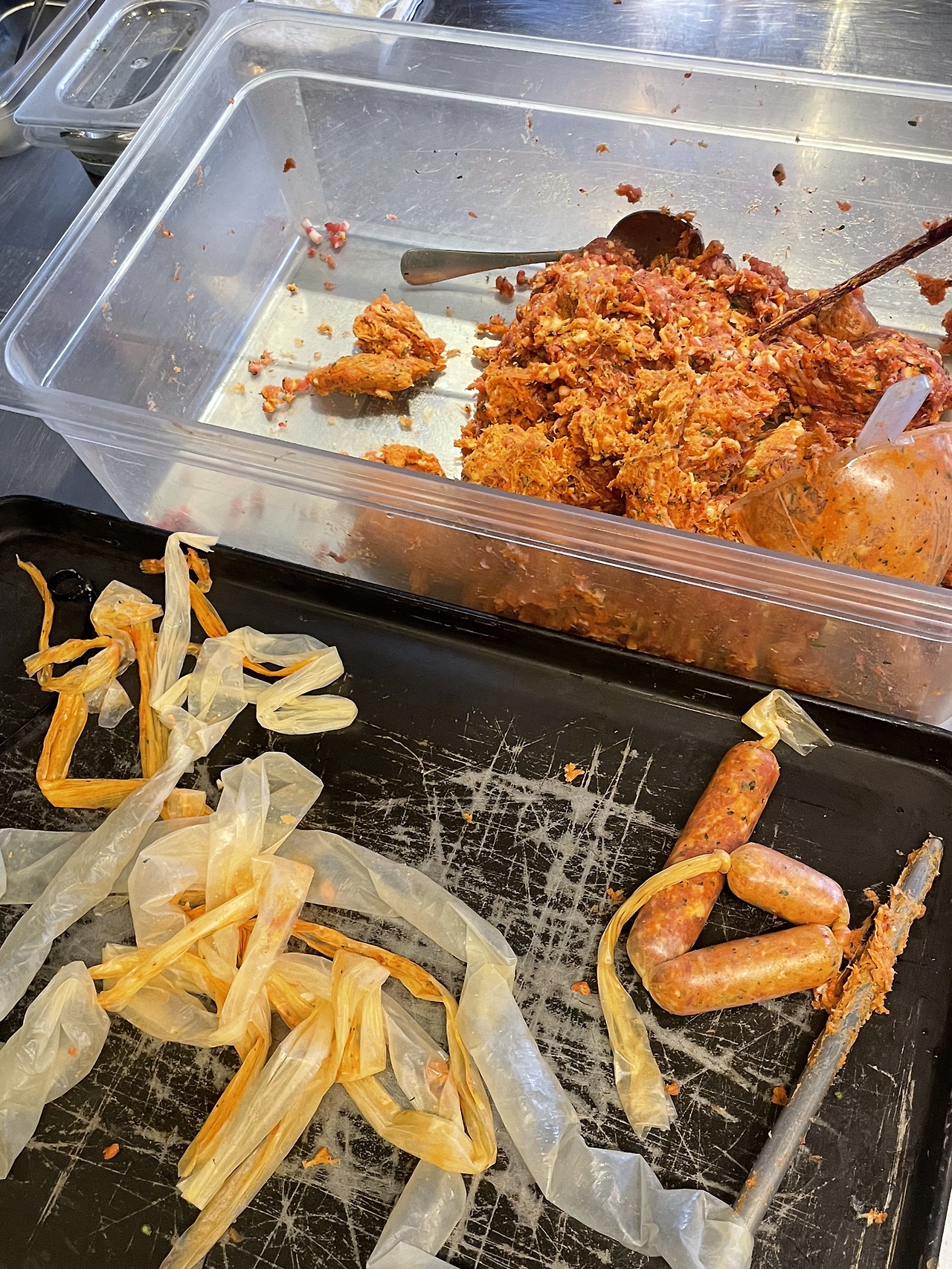 속을 채워 넣는 과정에서 우리는 끝없이 의심했습니다. ‘이게 된다고?’ GPT에게도 물어보고 유튜브 영상도 찾아봤지만 저희처럼 깔때기 하나로 만드는 방법은 없는 것 같더라고요. 그럼에도 “분명 도구가 없던 시절, 옛날 사람들은 어떻게든 만들었을 거야” 라며 방법을 찾았지만 결국 [도구가 개발된 뒤 소시지가 탄생했다]로 결론이 났습니다. 아마 깔때기의 입구가 조금 더 넓고 길었더라면 가능했을 것 같지만, 다음번엔 그냥 기계를 빌려와 만들어봐야겠습니다. 고기의 맛이 좋아서 메뉴로 개발시켜 보자는 이야기가 나왔으니 수확이 없던 것은 아니네요. 아무튼 동료들과 즐거운 시간을 보냈습니다.
