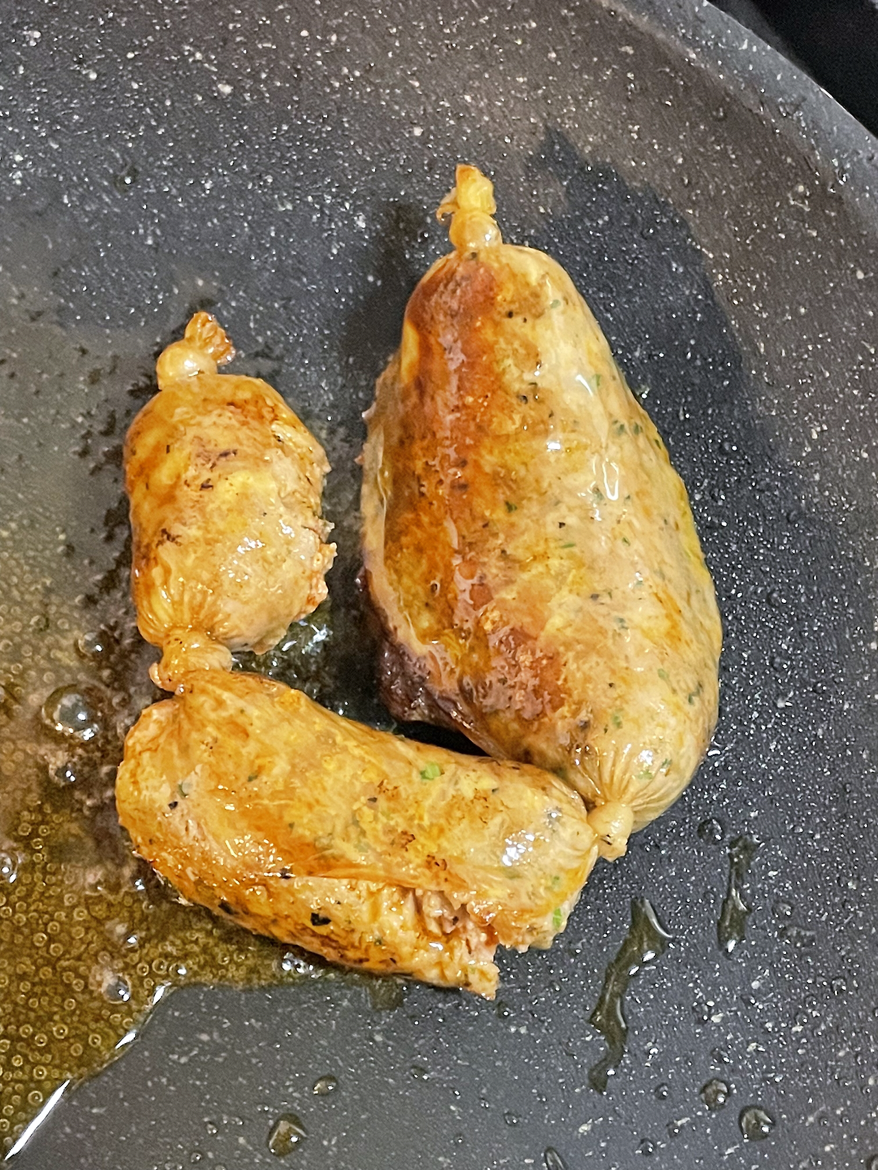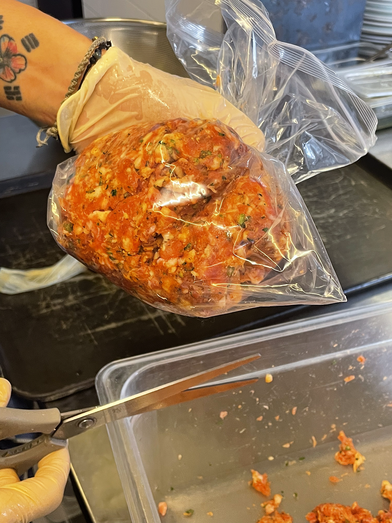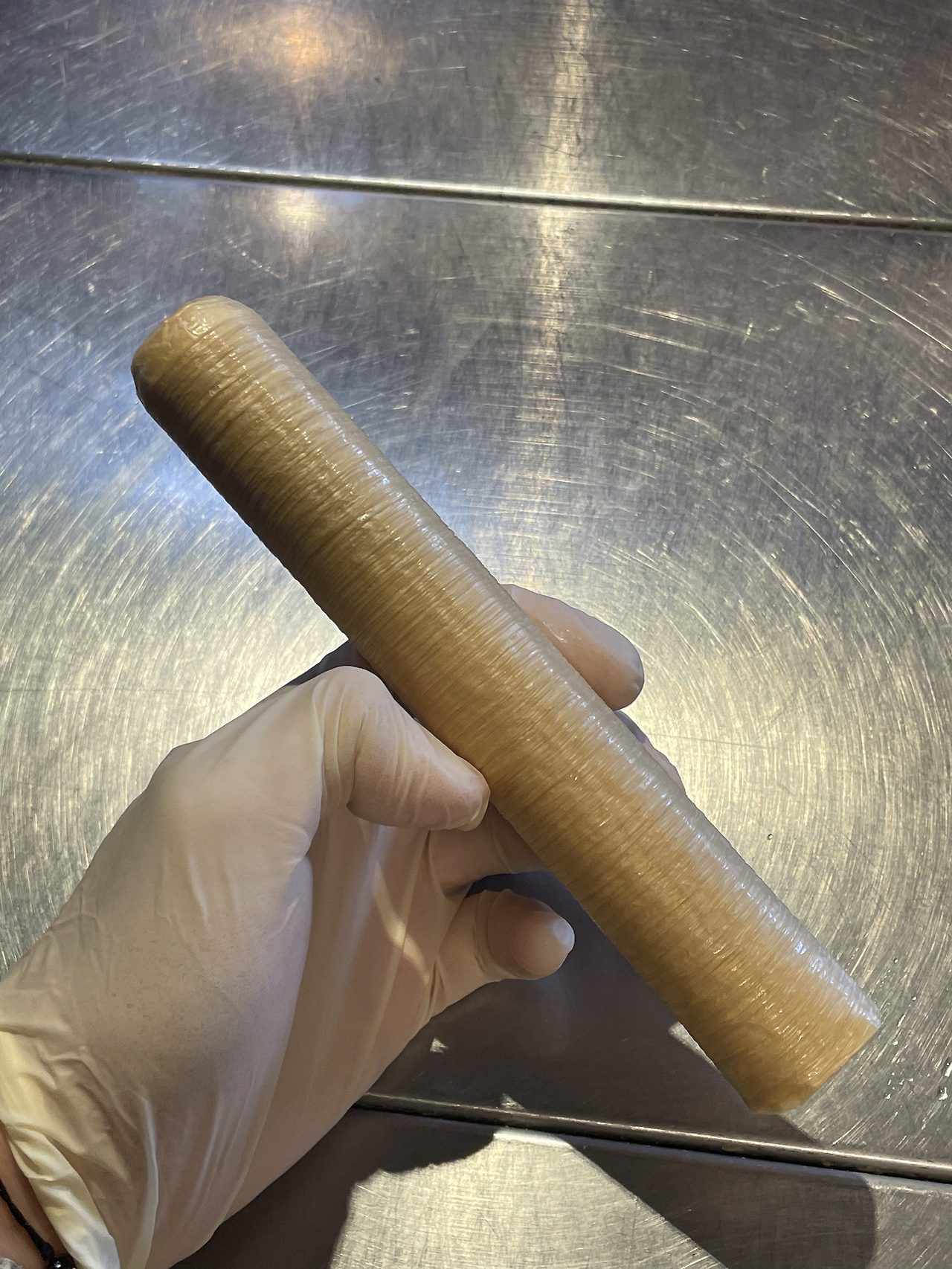 속을 채워 넣는 과정에서 우리는 끝없이 의심했습니다. ‘이게 된다고?’ GPT에게도 물어보고 유튜브 영상도 찾아봤지만 저희처럼 깔때기 하나로 만드는 방법은 없는 것 같더라고요. 그럼에도 “분명 도구가 없던 시절, 옛날 사람들은 어떻게든 만들었을 거야” 라며 방법을 찾았지만 결국 [도구가 개발된 뒤 소시지가 탄생했다]로 결론이 났습니다. 아마 깔때기의 입구가 조금 더 넓고 길었더라면 가능했을 것 같지만, 다음번엔 그냥 기계를 빌려와 만들어봐야겠습니다. 고기의 맛이 좋아서 메뉴로 개발시켜 보자는 이야기가 나왔으니 수확이 없던 것은 아니네요. 아무튼 동료들과 즐거운 시간을 보냈습니다.