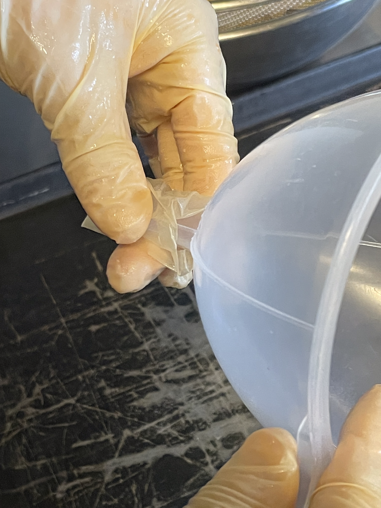 4. 케이싱의 끝 부분을 잘 찾아 공기를 빼주고 깔때기를 이용해 속을 채워 넣습니다. 15m가 넘는 케이싱은 엉키기가 쉬우니 잘 차곡차곡 잘 정리해 작업합니다.