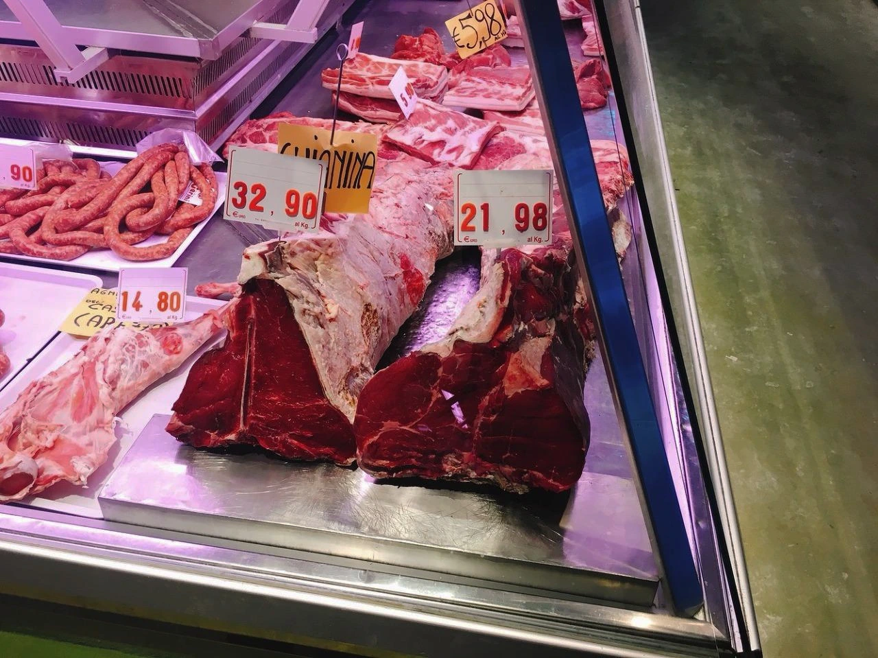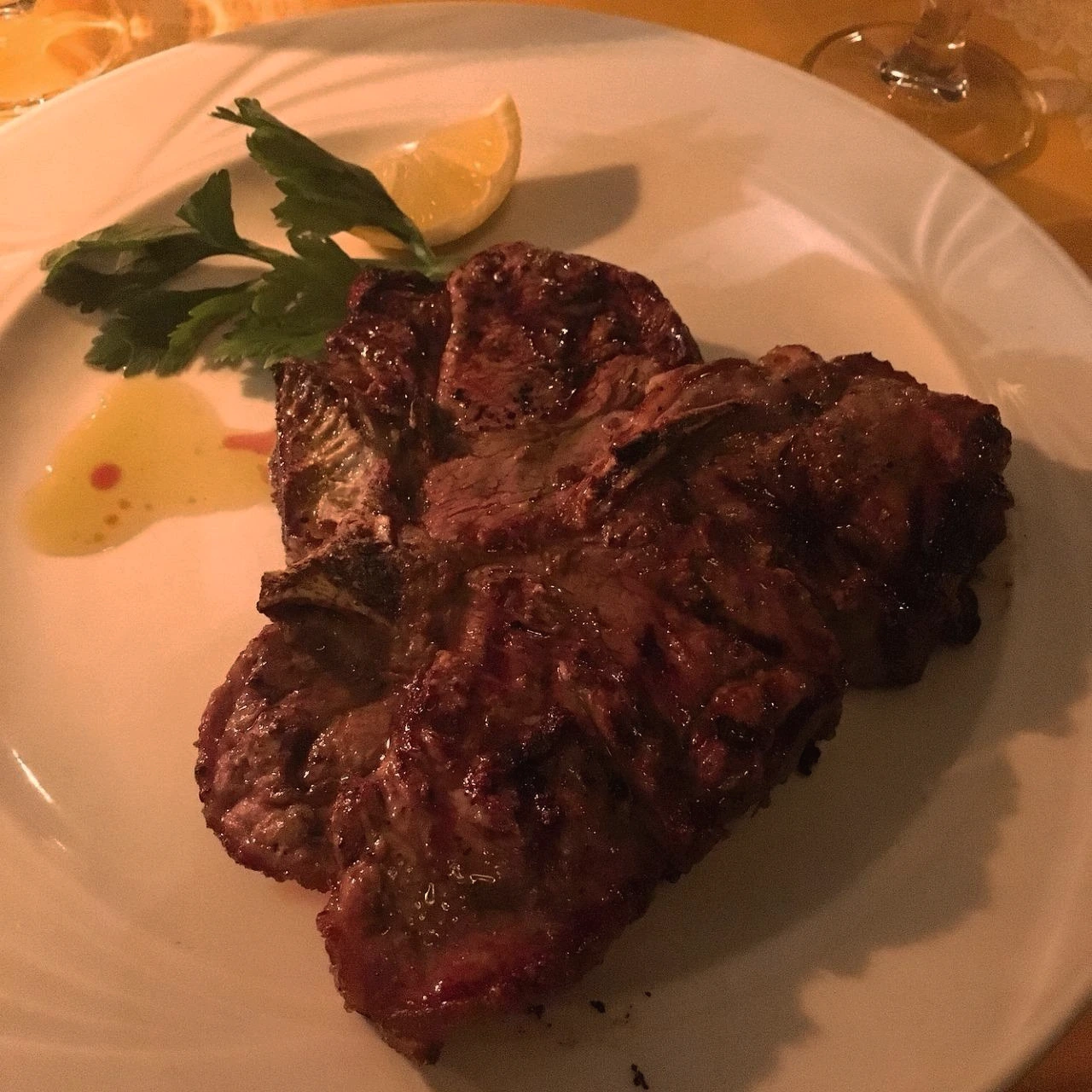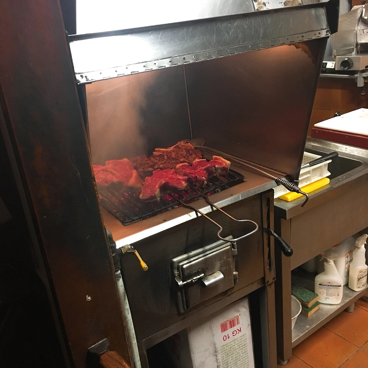 한 가지의 고기이면서도 지역, 나라마다 이름이 다른 이 녀석은 티본스테이크(T-bone)또는 포터하우스(porterhouse steak), 이탈리아어로는 Bistecca alla Fiorentina(피렌체 사람들의 스테이크)로 불린다. 위에서도 잠깐 언급했듯 이 스테이크는 말 그대로 피렌체 사람들의 소울푸드인 샘이니 이 곳에 왔다 하면 꼭 먹어봐야 하지 않겠는가. 숙소에서 베끼오 다리를 건너 두 번째 블록 직진, 왼쪽으로 돌아 조금 걷다 보면 보르디노 식당(Trattoria bordino)이 나온다. 친구의 추천으로 방문했는데 당시 그녀는 "고기만 놓고 보면 유명한 뜨라또리아 자자(Trattoria zaza)나 부카마리오(Buca Mario)보다 낫다" 라며 장언 했다. 내 기억으로는 한 10유로 정도 했던 것 같은데 끼니마다 거의 2인분씩 해치우는 우리도 만족스러운 양이니 실로 엄청난 가성비라 말할 수 있겠다. 고기는 주방에서 나오는데 냄새는 분명 직화로 구워낸 녀석이다. 궁금함을 참지 못하고 주방으로 들어가 보니 초벌구이 막창집에서나 볼 수 있는 실내용 그릴이 떡 하니 한 자리를 차지하고 있다. 피렌체 스테이크의 특징은 소스 없이 소금과 후추만 뿌려 구워낸 뒤 레몬이나 라임 같은 시트러스와 간단한 가니쉬 정도만 같이 내는 점이다. 물론 장작직화로 구워내 한층 더 풍부해진 향기는 덤이다.