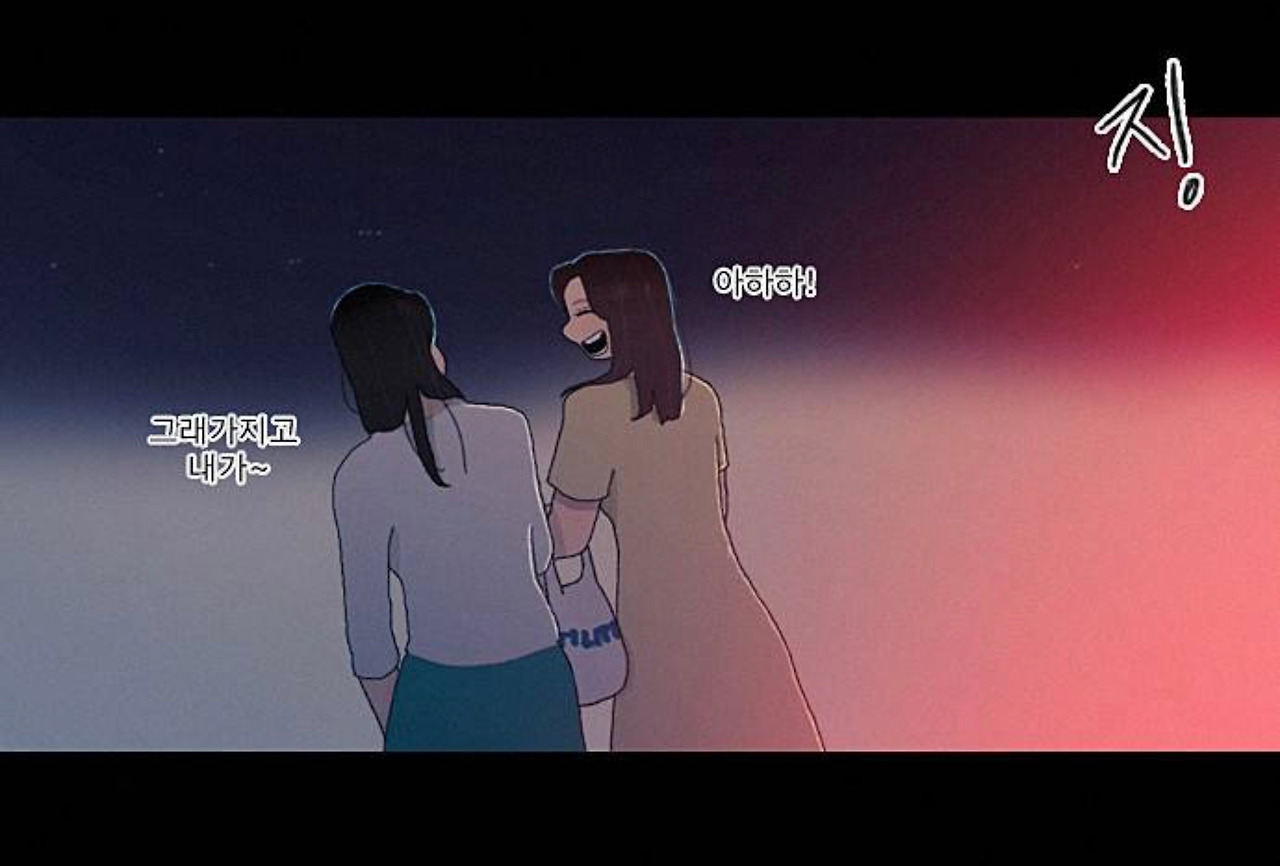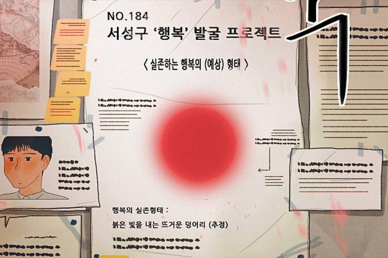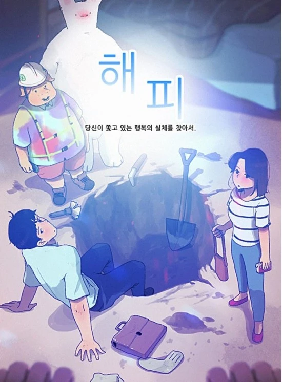 웹툰 ‘해피’에서 주인공들은 하나의 사건에 연결되어 있음으로 여러 가지 문제를 해결하는 과정이 각기 다름에도, 각자에게 ‘행복’이라는 에너지를 공유한다. 서선 기자와 그녀의 쌍둥이, 회사원 두레는 목숨을 건지고, 자신감 넘치는 인물로 변했으며 고고학자 ‘미스터 차’는 마침내 행복을 발굴해내는 데 성공한다(인지하지 못함). 건너집 히키코모리는 수년만에 문 밖으로 나가 세상을 받아들이게 된다. 내가 생각하는 행복의 근원이나 원리는 작품에서 나온 대로 붉고 뜨거운, 팽창하는 어떤 에너지라고 생각한다. 우리는 이것들을 대화와 사랑, 또는 사건을 통해 서로 공유할 수 있고 확장시킬 수 있다. 이 에너지는 긍정적이며 이것을 찾거나 만들어내는 방법이 바로 여러 방향의 만족이겠다. 우리가 오늘 다리 밑에서 떠들어댔던 시답잖은 얘기와 맥주가 왜 그렇게 재밌었는지 알 수 있다. 우리는 행복을 꽤 넓은 범위로 공유한다.