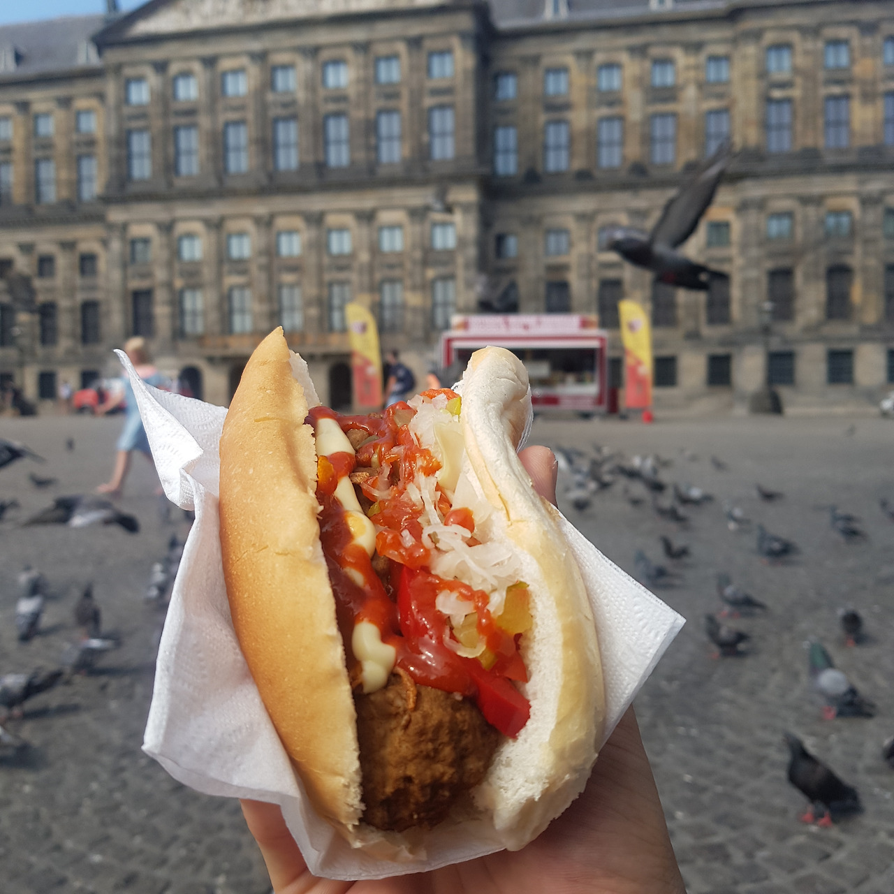 몰랐는데 집 앞에 기가 막힌 핫도그 집이 있더라. 무려 6가지 재료와 3가지 소스를 골라 뿌릴 수 있는 핫도그가 3.5유로!
