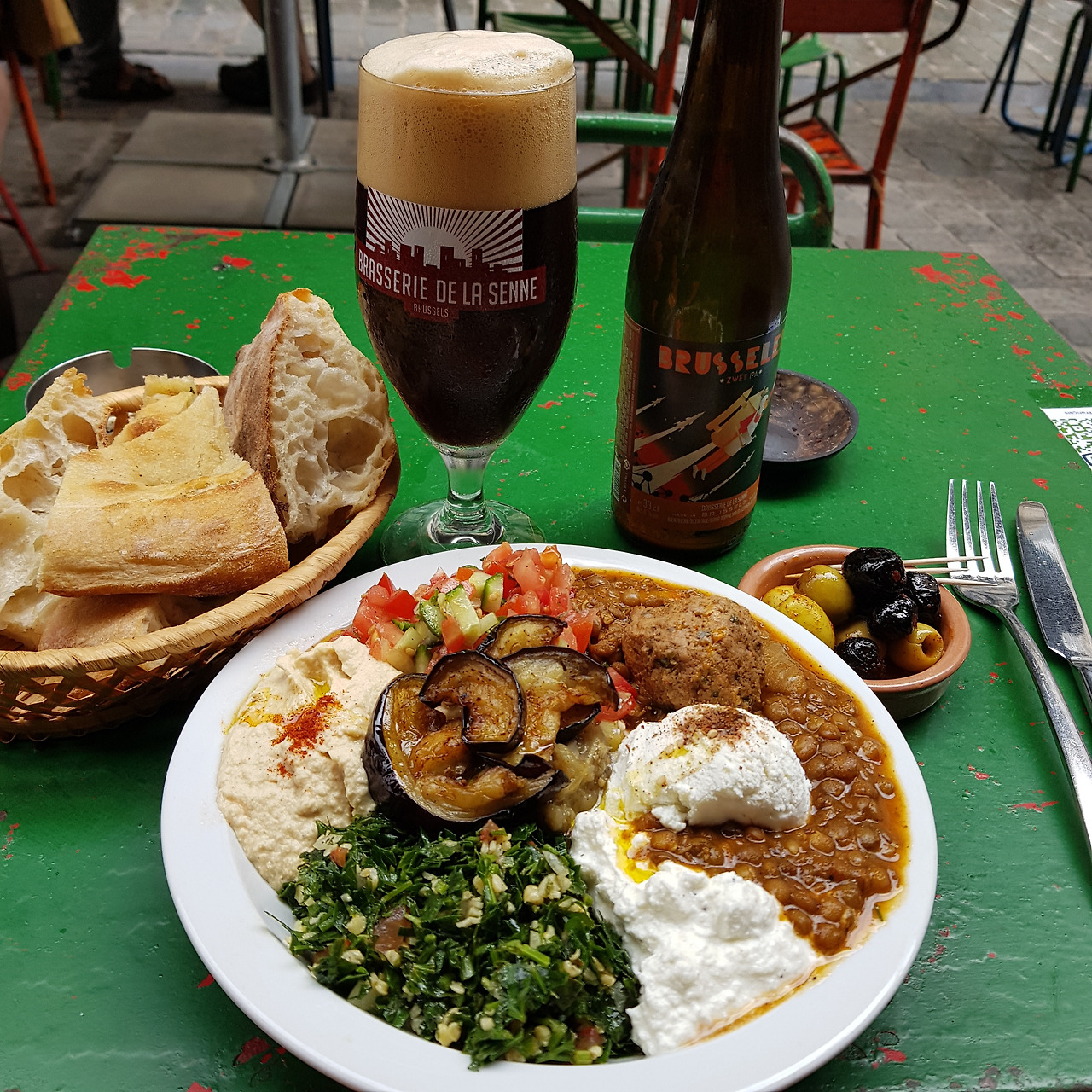 원래 중동, 아프리카 음식을 좋아해 샐러드를 제외하면 전부 훌륭했다(파슬리가 너무 강함). 염소치즈와 요거트, 구운 가지, 렌틸콩, 미트볼, 후무스를 얹은 북아프리카 식단이다. 무엇보다 맥주와 함께 딸려 나오는 올리브가 아주 맛있었음!