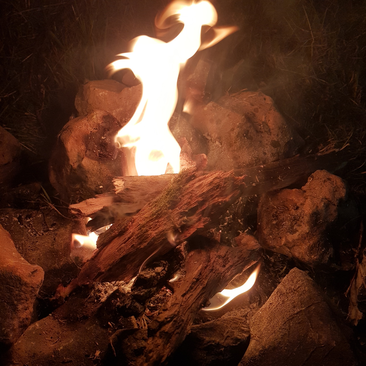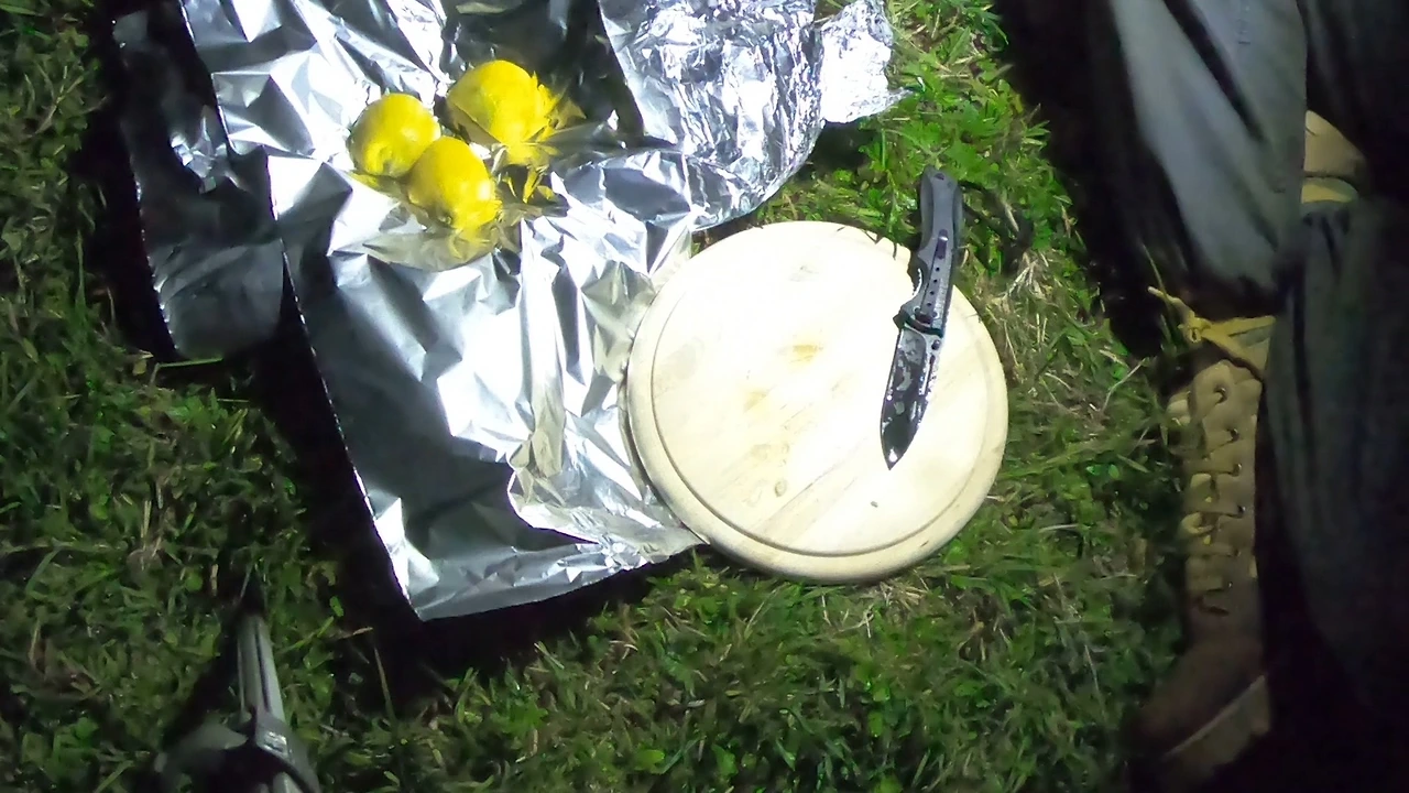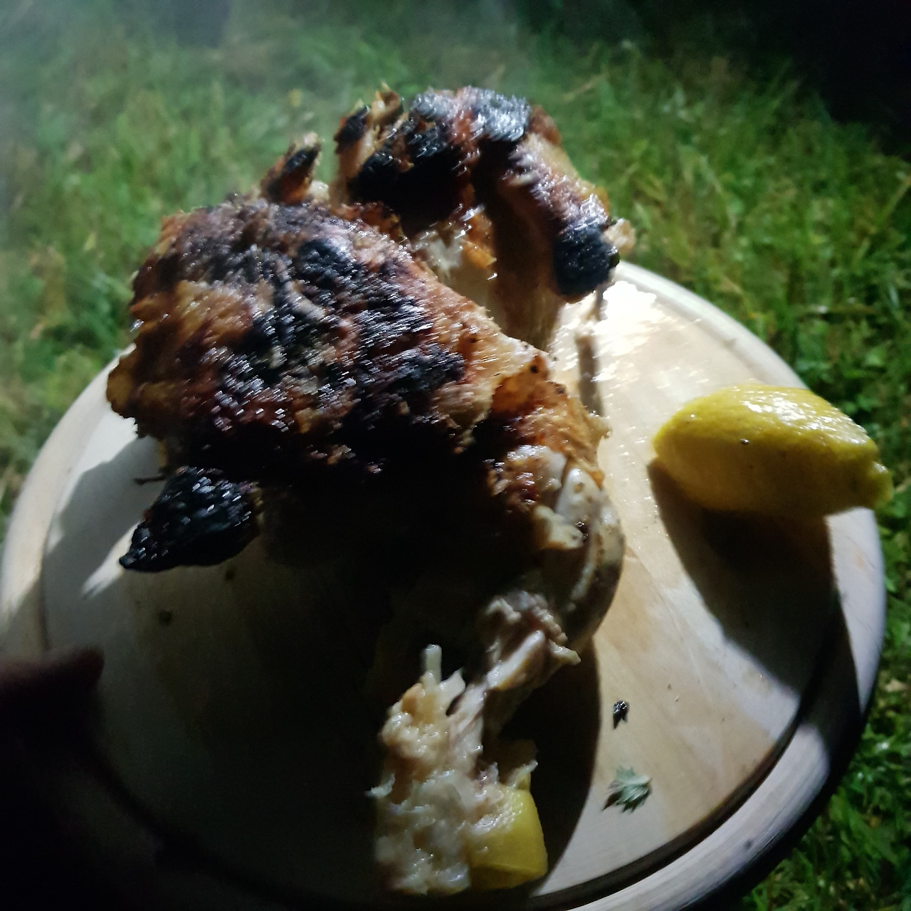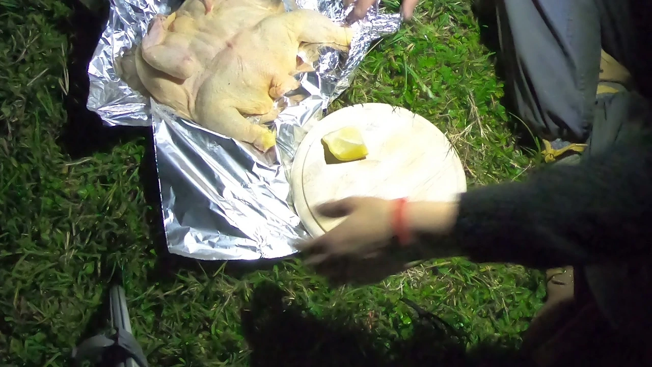 반으로 가른 닭에 레몬을 몇 개 썰어 넣고 주변에 돌을 쌓았다. 약 한 시간 정도 돌 위에 불을 지피고 30분 정도 더 두면 다 익을 것 같다.