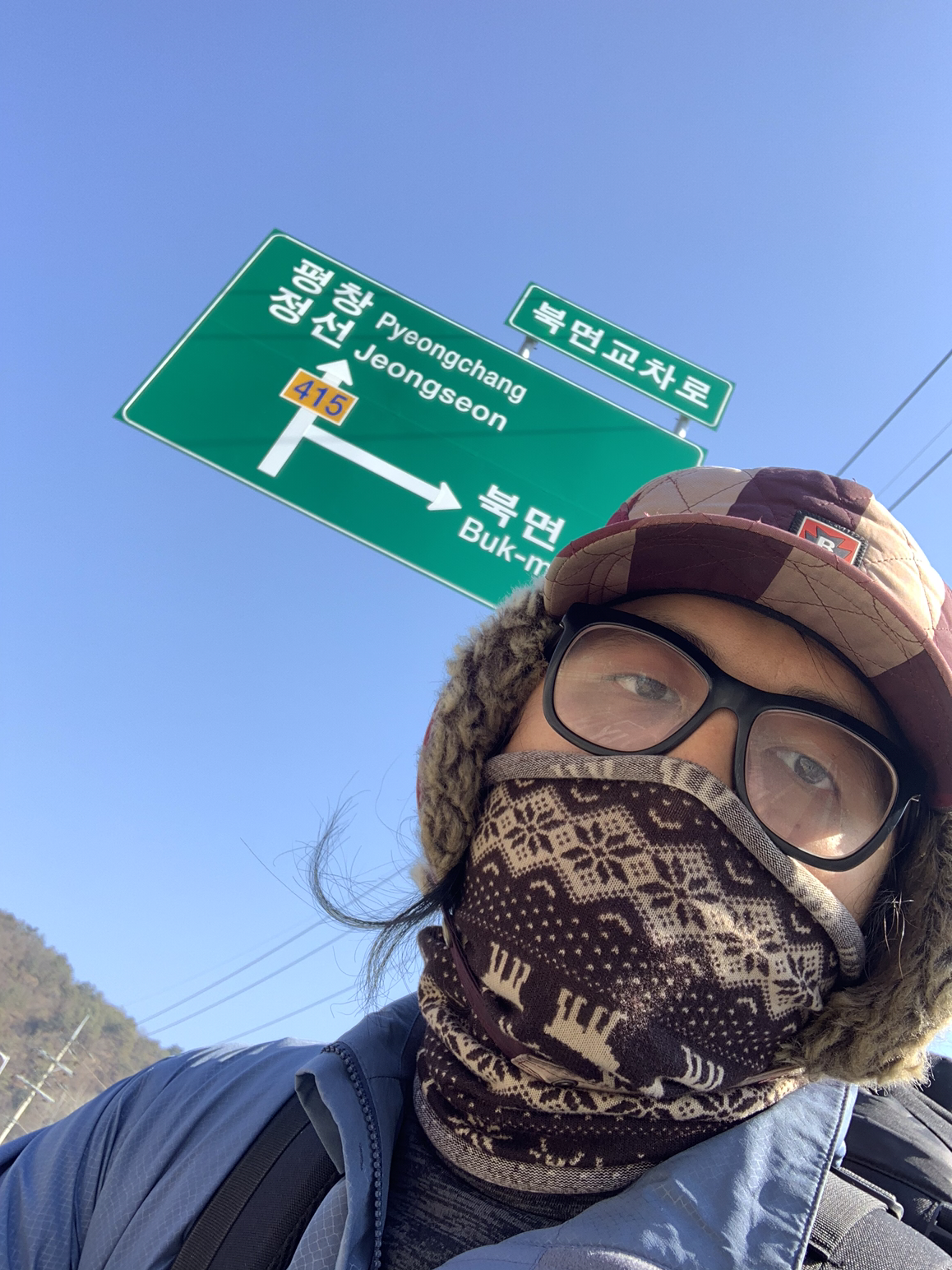 연당교에서 올라와 평창군 방향으로 걸었다. 출발한 지 30분 만에 편의점을 발견했다. 여분의 핫팩을 조금 더 사고 보조배터리를 충전했다. 오늘은 조금 일찍 일어난 김에 커피를 한잔 마셔도 괜찮을 것 같다. 햇볕을 맞으며 편의점 아이스 아메리카노를 마신다! 아! 문명의 맛! 화장실도 이용해야겠다!
