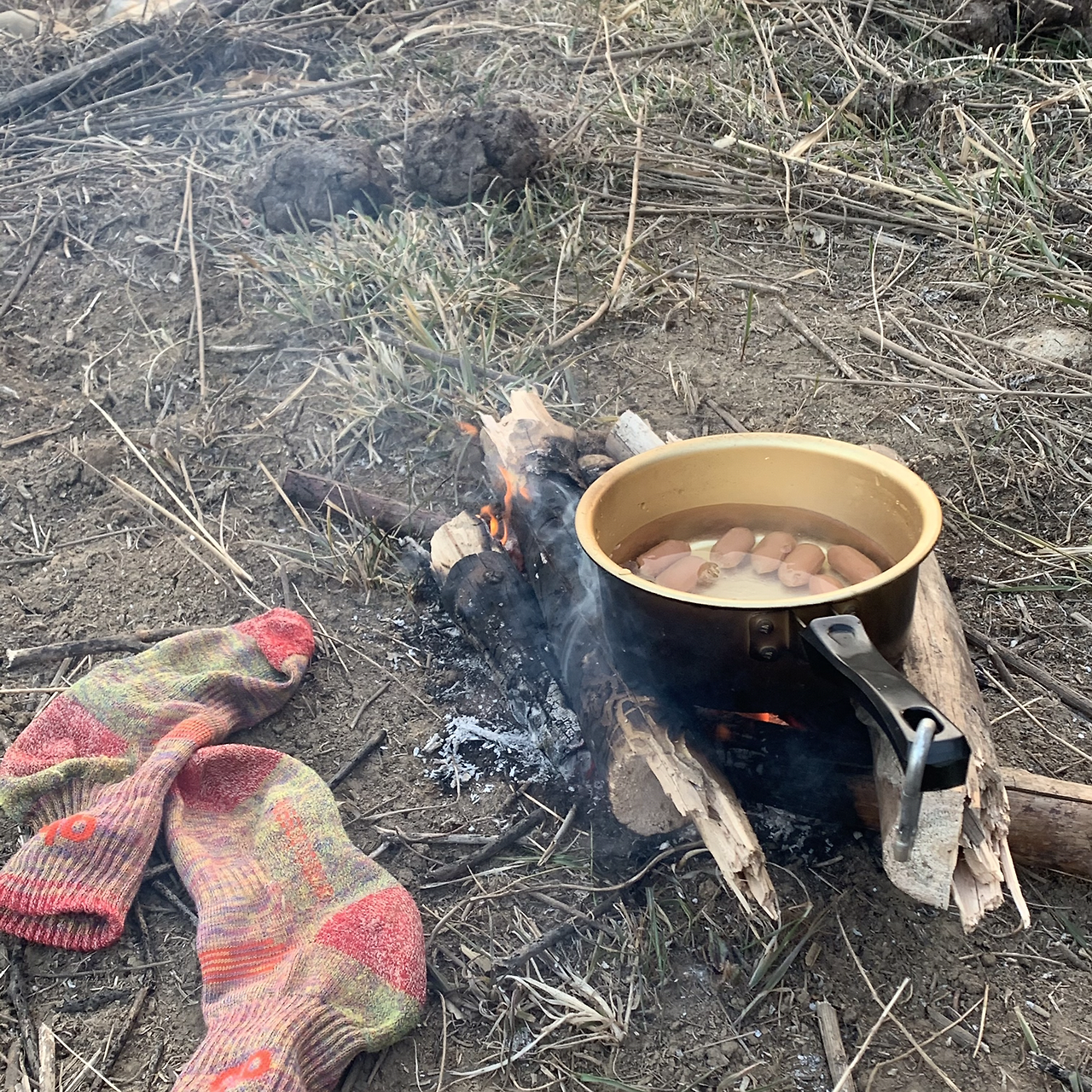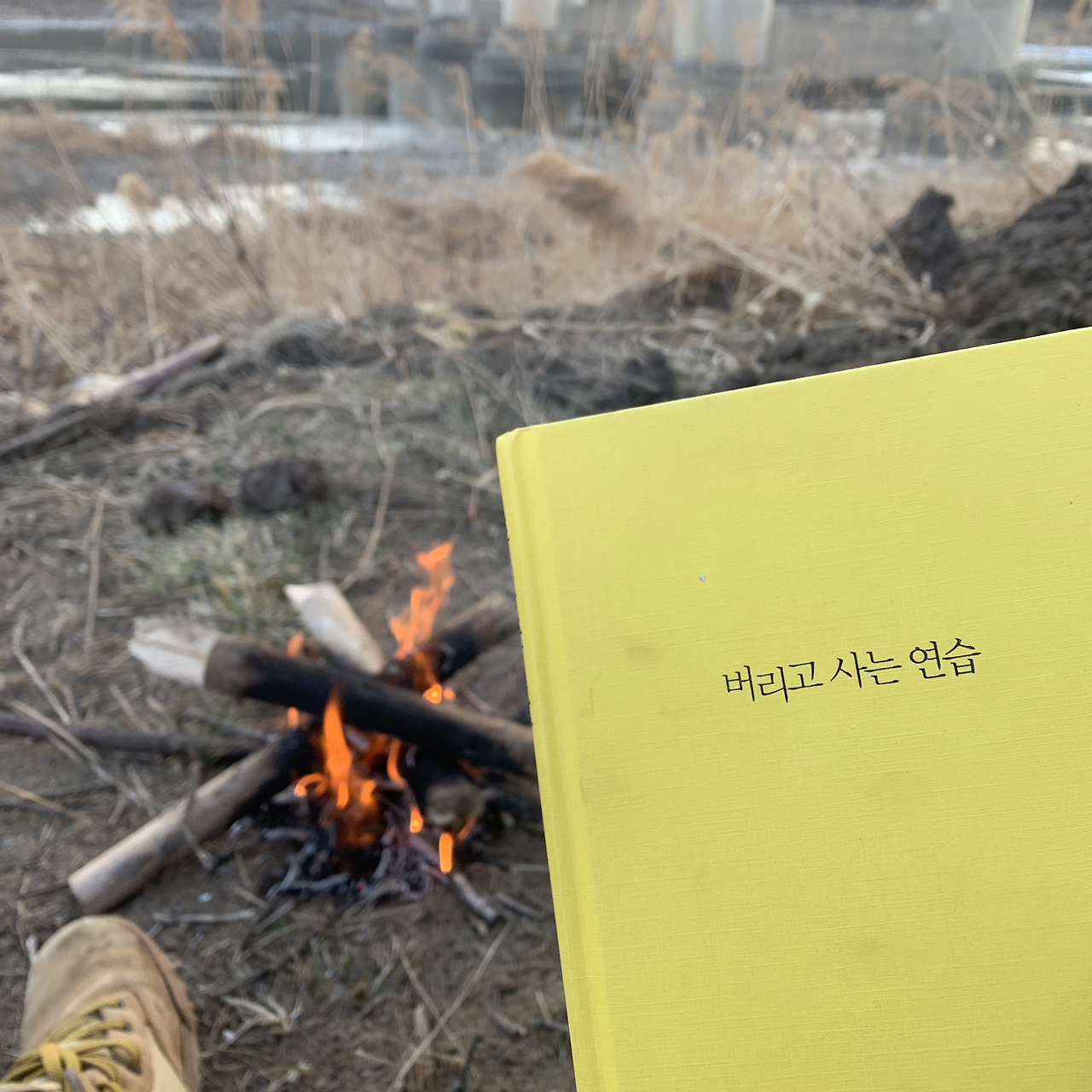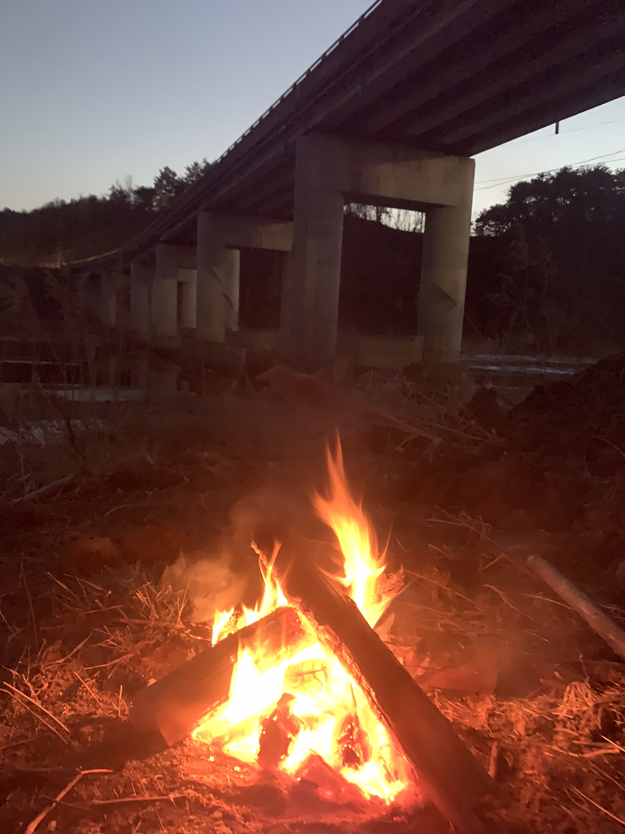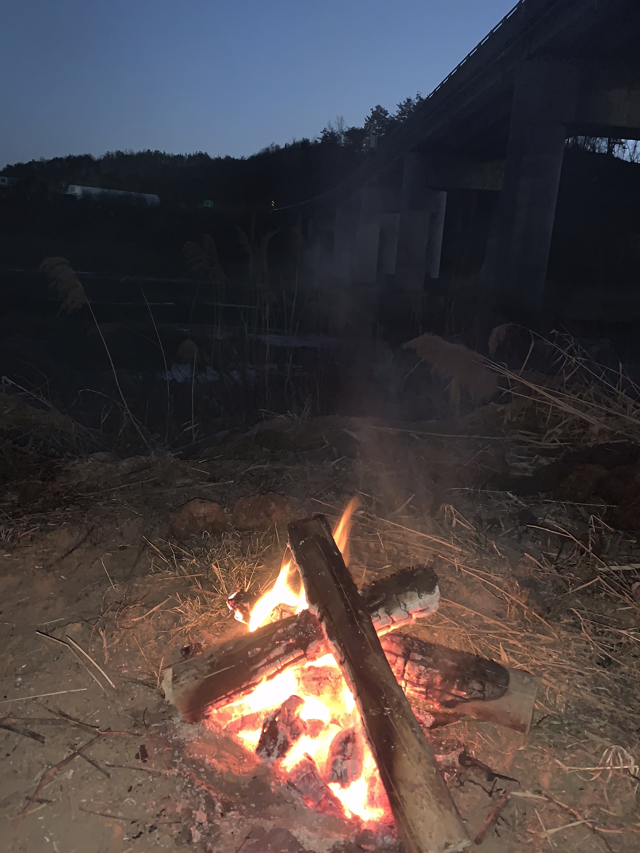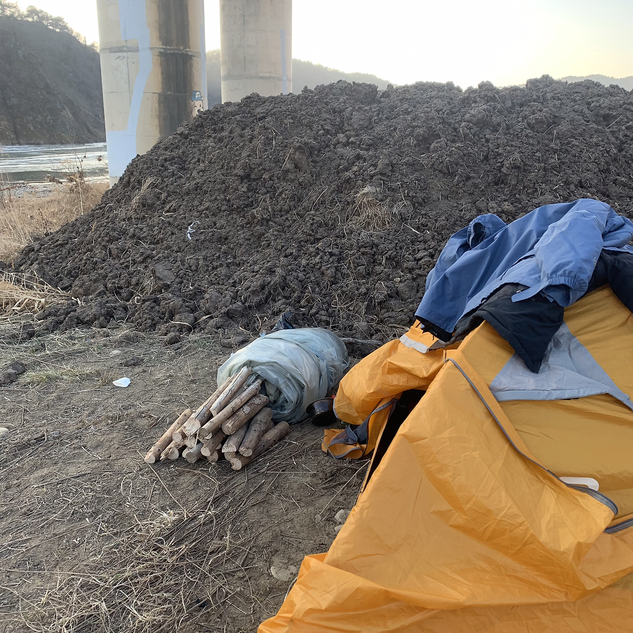 마땅히 잘 곳을 못 찾다가 지도에서 작은 강가를 발견했다. 큰 다리도 옆에 있어 바람도 피할 수 있을 것 같아 자리를 폈다. 쌓여있는 흙더미를 바람막이 삼아 텐트를 쳤다. 때마침 주변에 지지대로 썼던 나무가 버려져 있어 30분가량 열심히 톱질을 해 땔감을 넉넉하게 준비했다. 오늘은 날씨도 많이 춥지 않고 해가 지기 전 일찍 도착한 덕에 책을 읽을 좀 읽으려고 한다.