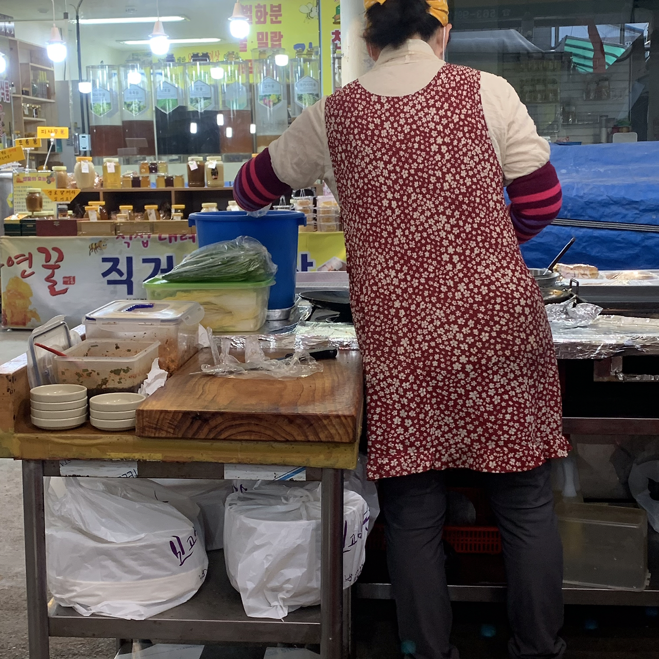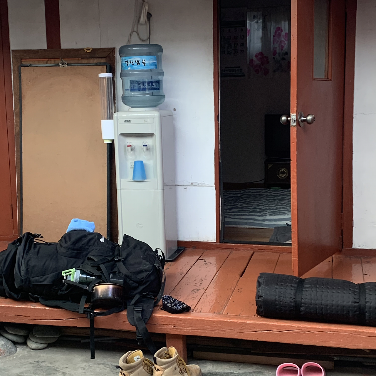 아주머니가 발 냄새가 난다고 얼른 씻으라고 하신다. 친절하게 슬리퍼와 수건도 빌려주셨다. 땀으로 젖은 몸을 샤워하고 내피로 입었던 트레이닝복 바지와 바람막이만 입고 거리로 나왔다. 바로 옆에 시장이 있으니 막걸리나 한잔 해야겠다.