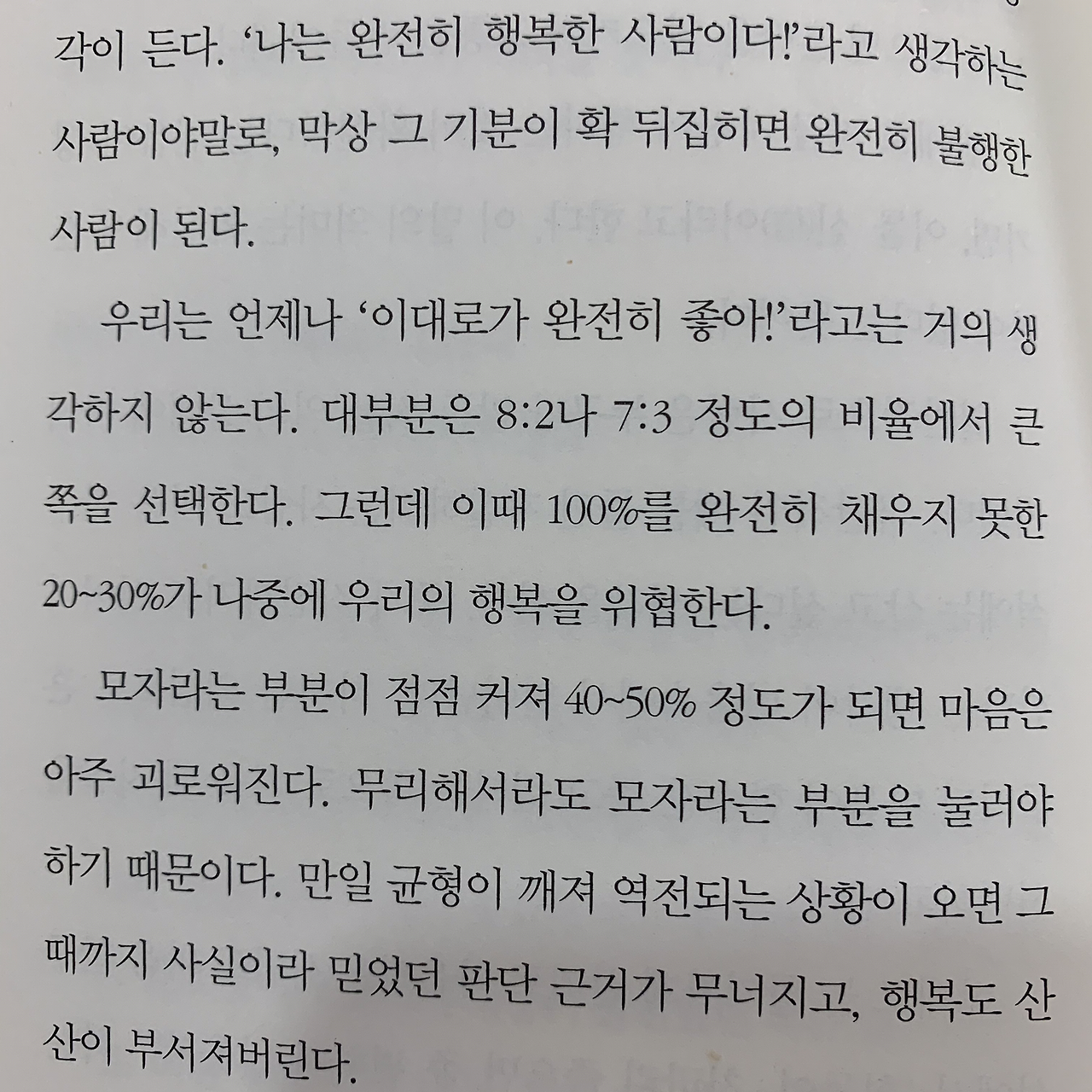 저자는 말한다. 미니멀리즘이란 진정한 의미에서는 ‘갖지 않는 것’이 아니라 ‘필요한 것을 명확하게 아는 것’이라고, 이는 늘 상황에 따른다. 지금의 내 상황에서 필요한 것은 충분한 양의 땔감과 소똥이다. 이번 여정을 마치고 도시에 돌아가면 또 필요한 것이 생길 것이다. 아니면 필요하다는 생각을 강요당할 것이다. 거리의 수많은 광고판과 대중매체는 우리에게 무엇인가를 필요하게 만든다. 심지의 우리의 열망이나 욕구 또한 나의 것이 아닌 3자의 욕망이나 욕구일 수도 있다. 중요한 건 나의 주관적인 가치판단으로 무엇을 필요로 하고 무엇을 필요로 하지 않는지 선택하는 것이다. 가득 채운 마음은 즐거움을 온전히 받아들일 공간이 부족하다. 약간 모자라고 약간 여유롭게. 배가 고파야 배가 부를 수 있고 졸려야 잠을 잘 수 있다.