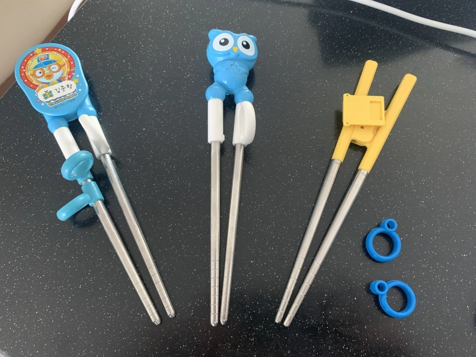 포크와 이별하고 4~5살 즈음 처음 만난 젓가락이 사진의 가장 왼쪽에 보이는 뽀로로 젓가락이다. 아마 이걸로 1년 반 정도 연습을 하고 약간 익숙해지자 고리를 하나씩 하나씩 빼주었다. 처음에는 고리 하나만 빼주고 6개월 정도 보냈고, 다시 고리 하나 더 빼고 6개월 정도 지난 다음 사진의 가장 오른쪽 형태 젓가락을 6개월 정도 쓰다가 두 개로 완전히 분리된 어린이 젓가락을 사용하게 되었다. 물론 식당에 가서도 잘 하진 못하지만 아이도 엄마 아빠와 같은 어른 젓가락을 쓰려고 무던히도 노력하였다. 지금도 물론 짜장면이나 파스타와 같은 좋아하는 음식이지만 젓가락으로 먹기에는 잘 미끄러지는 면들에 왕포크를 사용하긴 하지만 여전히 잘 따라와 주고 있어서 기특할 따름이다.