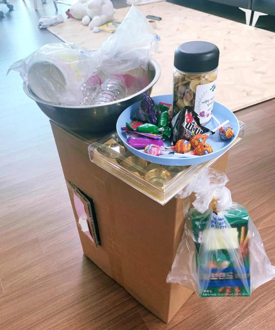 바로 간식 카트! 택배 박스 옆을 뚫어서 문을 달고, 그 안에 먹을 걸 잔뜩 집어 넣은 다음 위에는 물과 종이컵, 그외 다수의 간식거리..빼먹으면 어색한 카트 앞부분에 매달린 비닐 봉지.ㅋㅋㅋ 나는 간식 카트 하면 기차에서 만난 간식카트가 떠오르는데..아이가 기차에서 간식 카트를 본적이 있나? 생각이 들었다.