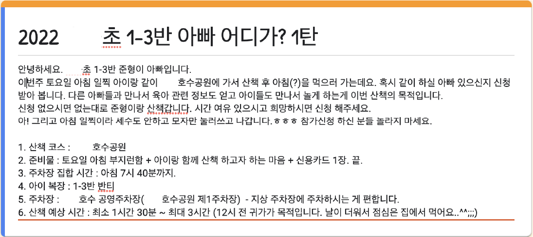 설문지를 만든 다음 와이프한테 부탁하여 아이 반톡에 입장하였고 엄마들이 주로 있는 아이 반톡에 매력적인 제안(아빠 어디 가?)을 올렸다. 사실 제안을 올리면서 아무도 참여하지 않으면 어쩌나 하는 걱정스러운 생각에 긴장하였지만 다행히 아이 등하교 길에 자주 보던 엄마들이 나를 불쌍히 여겼는지 호응을 해주셨다. 다행스럽게 참여하겠다는 아빠 한분이 있어 토요일 아침 '아빠! 어디가?' 1탄은 시작할 수 있게 되었다.