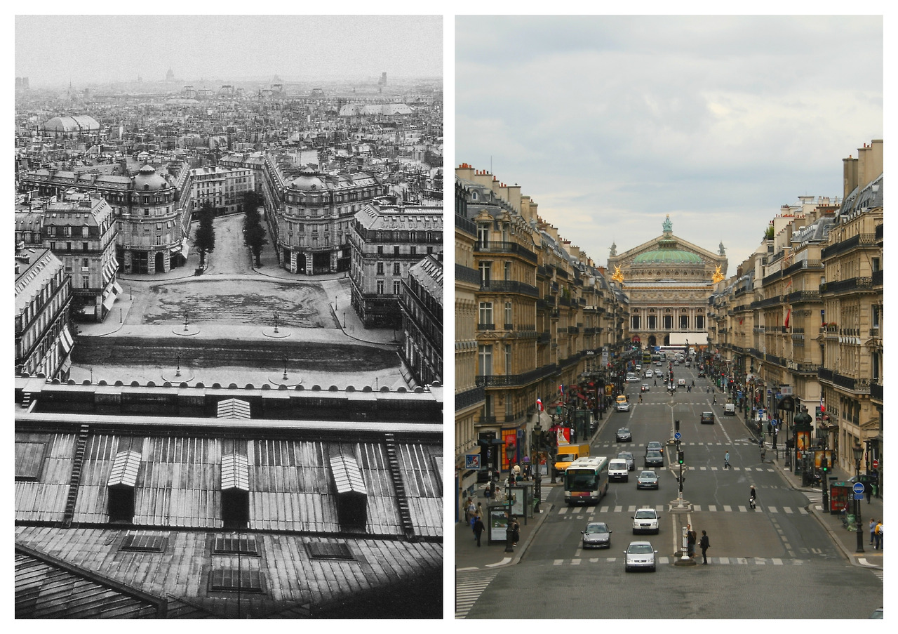 왼쪽 사진 : 오페라 지붕에서 광장으로 내려다본 전경 - View of the Place de l’Opéra from the top of the Opéra, c. 1870 (출처 : © Wikimedia Commons – Public Domain)