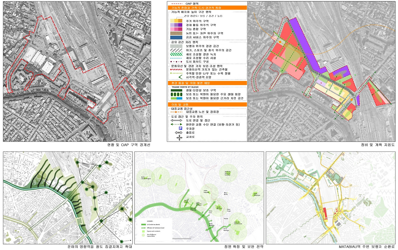 Grand Matabiau – Quais d’Oc 지역의 OAP는 툴루즈 Matabiau 역 일대를 보다 지속가능하고 연결된 도시 중심지로 변화시키기 위한 전략적 도시계획이다. 주거, 업무, 상업 기능을 균형 있게 조성하고, 특히 운하의 영향력을 역까지 확장하는 전략, 도시 정원 네트워크, 그리고 Matabiau 보행 루프를 통해 수변 경관 강화, 녹지 확충, 보행 중심 이동체계 구축을 동시에 추진한다. 이러한 방향을 바탕으로 장기적 관점에서 일관된 도시재생의 틀이 마련되며, 시간에 따라 단계적으로 발전할 수 있는 기반이 구축된다. 즉, 환경, 교통, 경관을 통합한 도시 중심부의 미래상을 구체적으로 제시하는 계획이라 할 수 있다.