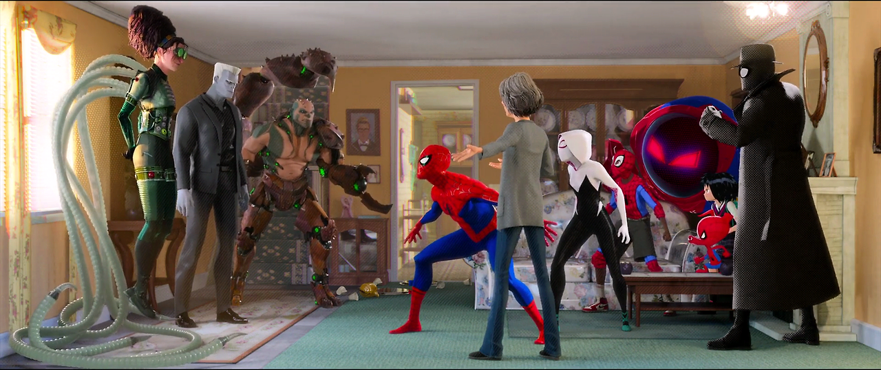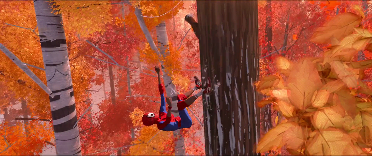 영화 스파이더맨을 보는 재미는 거미줄을 타고 뉴욕의 빌딩 숲 사이를 날아다니며 악당을 처치하고 어려운 사람을 돕는 스파이더맨을 보는 데 있다. 이 영화에서도 물론 그런 장면이 적지 않게 나온다. 그렇지만 애니메이션이라서 아무래도 실사영화에 비해서는 박진감이 덜하다.