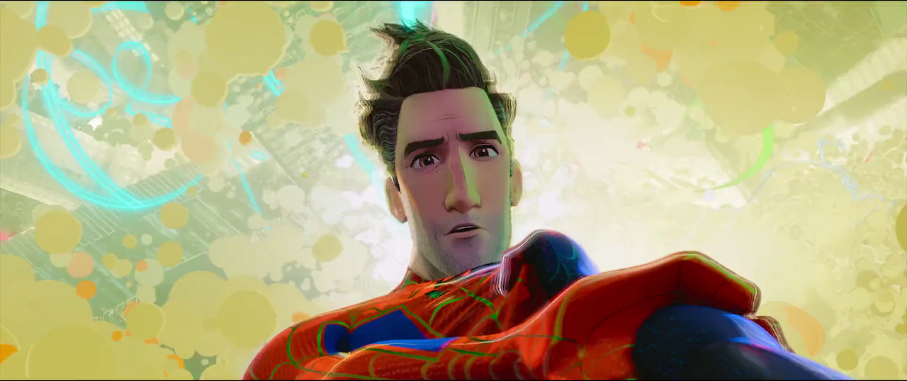 브루클린에 사는 마일스 모럴리스는 삼촌 알론과 함께 고가도로 아래에서 담벼락 낙서(graffit)를 하다가 돌연변이된 거미에게 물려 특수한 능력을 얻게 된다. 마일스는 역 지하도에서 윌슨 피스크과 글린 고부린 등이 가속기를 사용하여 다른 차원과의 문을 여는 실험을 하고 있는데 함께 참여한다. 그때 스파이더맨(피터 파커)이 나타나 실험을 저지시키려고 하지만, 가속기가 오작동하여 중상을 입는다. 피터는 마일스에게 소형 메모리 스틱을 맡긴 후 킹빈에 의해 살해된다. 이미 피터는 날렵하게 뉴욕의 건물 사이를 날아다니던 옛날의 그 스파이더맨이 아니다. 중년이 된 피터는 스파이더맨 슈트를 입었음에도 불구하고 똥배가 나왔고, 얼굴 마스크를 벗으면 삶에 지친 꾀죄죄한 중년 남성의 모습이 그대로 드러난다.