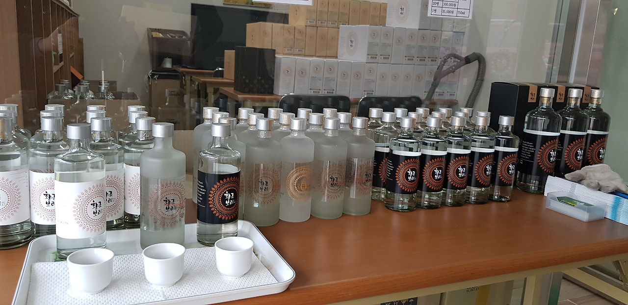 차를 세워두고 사무실을 겸하고 있는 전시관으로 들어가니 여사장님이 나와 설명을 해준다. 황금보리술은 보리를 원료로 한 증류식 소주로 여기서 판매도 한다고 한다. 종류는 3종인데, 17도, 25도, 40도짜리가 있다. 5병 한 세트 가격이 각각 25,000원, 35,000원, 70,000원이란다. 25도짜리 한 세트를 산 후 바로 출발.