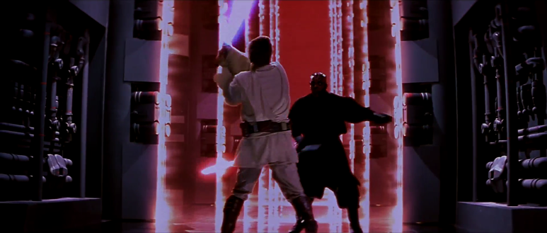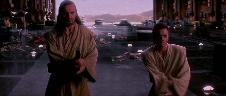 옛날 옛적 은하계 한쪽에서는 분쟁의 싹이 트고 있었다. 무역항로를 독점하려는 무역연합이 아미달라 여왕이 다스리는 나부 행성을 공격하자 이들을 지키기 위하여 제다이 기사인 마스터 콰이콘과 그의 제자 오비완이 파견된다. 두 제다이 기사는 아미달라 여왕을 구출하여 공화국으로 귀환하는 길에 무역연합의 공격을 받아 타투인 행성으로 피한다. 무역연합의 공격을 받은 우주선은 고장이 나서 이를 수리하기 위한 부품이 필요하다. 부품을 구하기 위하여 고물상에 들렀지만, 오비완은 부품을 살 돈이 없다.