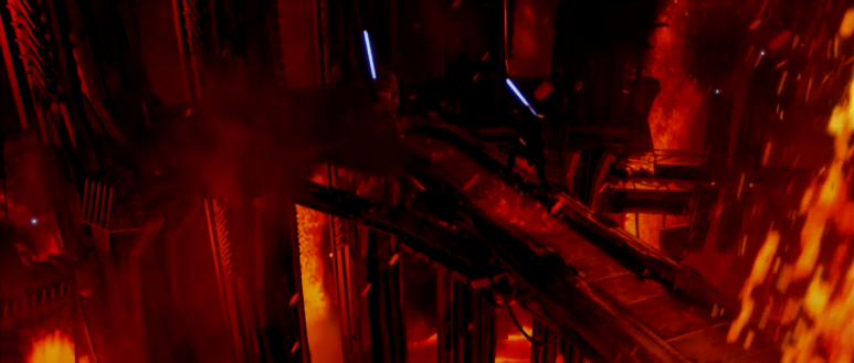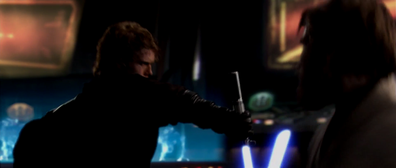분노한 오비완은 용암이 들끓는 지하에서 아나킨을 찾아 결투를 벌인다. 오비완에게 있어 아나킨은 아들과 같다. 아나킨 역시 오비완을 아버지처럼 생각했는지도 모른다. 이 싸움에서 오비완은 아나킨의 팔다리를 모두 잘라 버리고, 아나킨의 몸은 용암 속으로 떨어진다. 오비완은 곧 아미달라 공주를 데리고 행성을 떠나나 아미달라 공주는 결국 쌍둥이 남매를 낳은 후 죽게 된다. 팰퍼틴은 용암 속에 던져져서 겨우 목숨만 붙어 있는 아나킨을 구해내고 그를 치료한다. 그러나 아나킨의 온몸은 화상으로 흉측하게 변하였다. 아나킨은 흉측한 자신의 모습을 감추려고 마스크가 달린 검은 투구를 쓴 ‘다스 베이더’로 새로이 탄생하게 된 것이다.