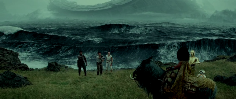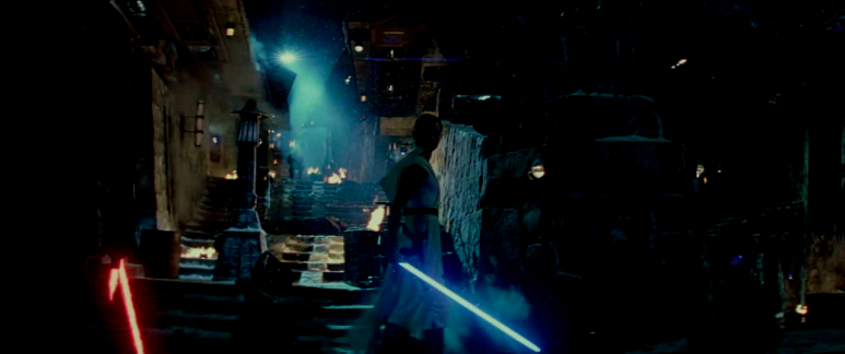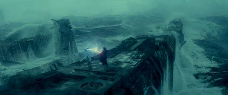 엑세골 행성의 바다는 거칠다. 높이가 수백 미터나 될 것 같은 격렬한 파도가 치고 있다. 펠퍼틴을 죽이러 간 렌과 레이는 바다에 떠있는 거대산 폐우주선 위에서 다시 대결을 벌인다. 이 장면이 이번 영화의 가장 압권이 아닐까 생각한다. 넘실대는 거대한 파도를 배경으로 렌과 레이는 치열한 대결을 벌인다. 렌이 수세에 몰린 레이를 공격하려는 위기의 순간 죽어가는 레아 공주의 마지막 포스가 렌과 연결된다. 레아는 죽어가면서 마지막으로 자신의 아들과 교감하였고, 악의 화신이 된 렌도 어머니의 마지막 죽음의 순간을 알고 충격을 받으면서 레이를 공격하는데 허점을 보인다. 이 기회를 노려 레이가 반격을 하여 광선검을 렌의 배에 관통시킨다. 배를 관통당한 렌은 죽어간다. 그렇지만 그는 마지막으로 어머니 레아 공주를 생각하며 선(善)의 힘으로 돌아온다. 이 모습을 본 레이는 그에게 포스의 힘을 주입하여 렌을 살려낸 후 펠퍼틴을 죽이러 떠난다.
