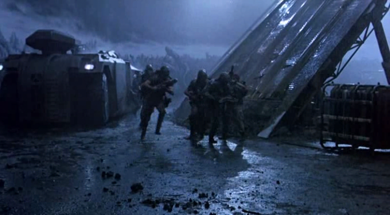 목표가 된 혹성에 도착하자 해병대는 완전 무장을 하고 우주 기지 안으로 수색을 위해 출발한다. 리플리는 에일리언이 주민들을 해쳤을지 모르므로 주의하라고 경고하지만, 해병대는 자신들의 무장을 믿고 에밀리언의 조언에 귀를 기울이지 않는다. 기지 속으로 들어간 해병들은 에일리언의 숙주가 되어 죽은 거주민들을 발견한다. 리플리의 만류에도 불구하고 점점 더 깊이 기지 속으로 들어간 해병들은 눈에 보이지 않는 에일리언들에게 포위된다. 이들 에일리언들은 배관을 통해 사방에서 해병들이 있는 곳으로 포위공격해 오고 있다.